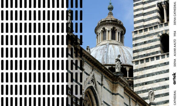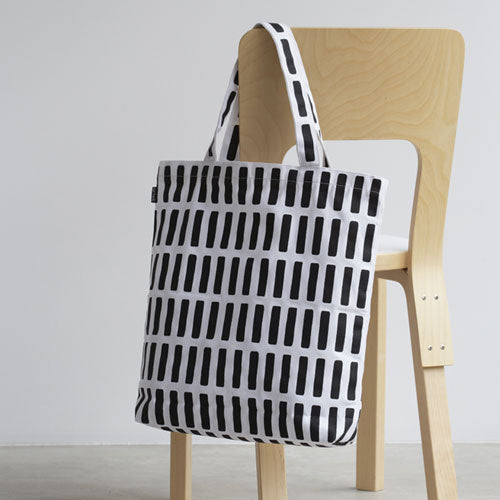 「SIENA」はアルヴァ・アアルトが1954年に自分の建築の室内のためにデザインしたテキスタイル。規則的な模様は、イタリア・トスカーナに在るシエナ大聖堂の大理石の縞模様を連想させます。ヘルシンキにあるアアルト自邸では、書斎入り口のカーテンやリビングに置いたピアノのカバーとして「SIENA」が使われています。こちらはキャンバスを使った丈夫なバッグです。【2010年デザイン】