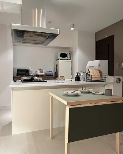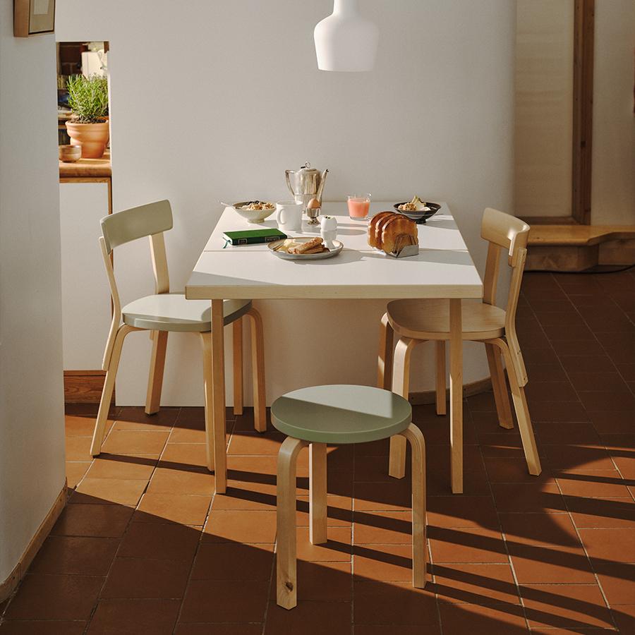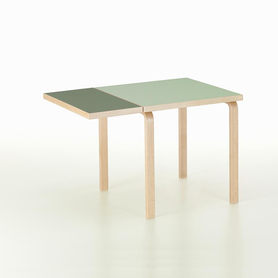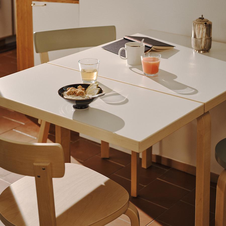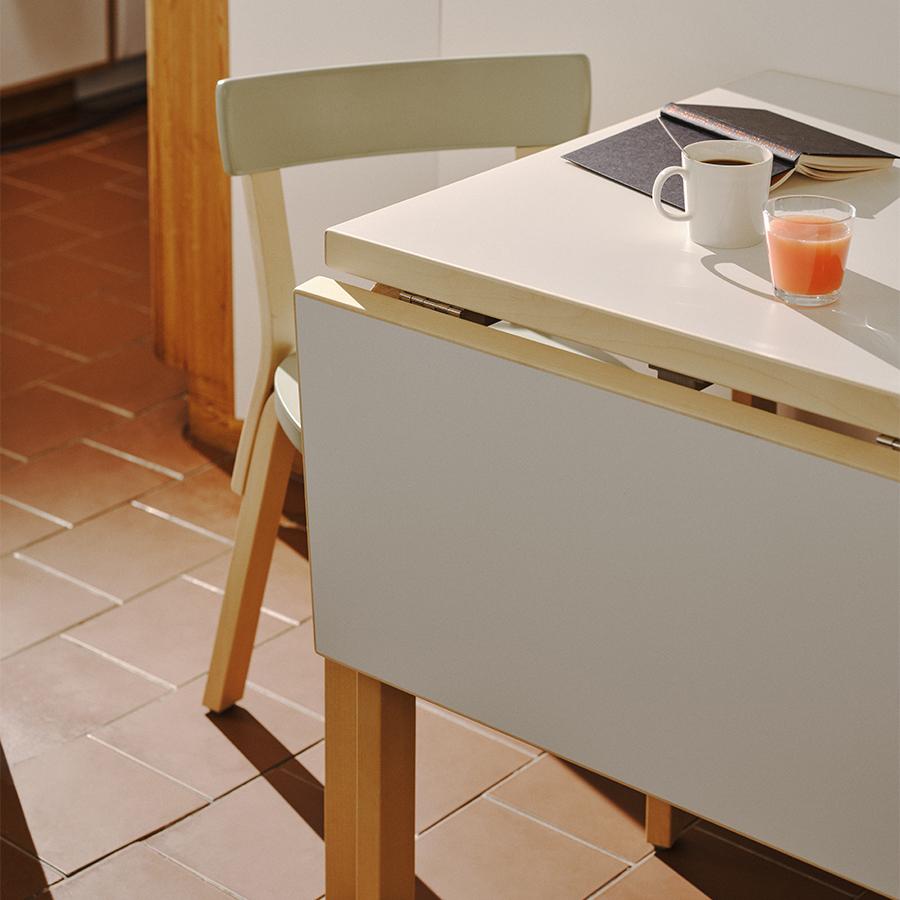 片側に折り畳まれた天板を広げることでスムーズに座席を増やし、必要に応じて限られた空間を有効に活用できるダイニングテーブルです。天板は、既存のアアルトテーブルと同様のナチュラルラッカー、リノリウム、ラミネートの3種類の仕上げを揃えています。