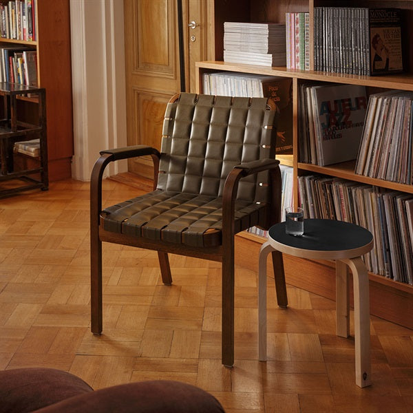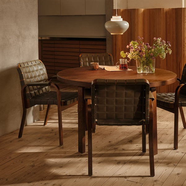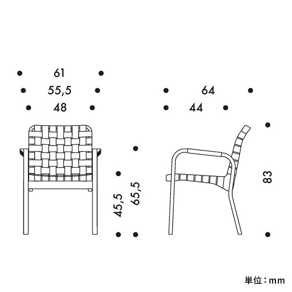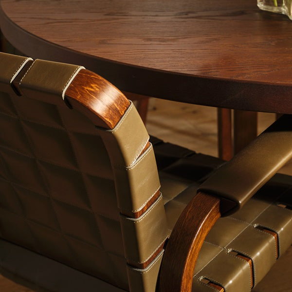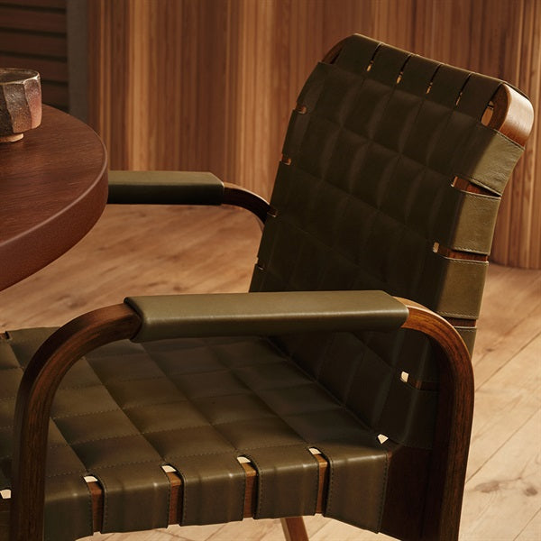 フィンランド産バーチ材のフレームに、キルティングレザーとリネンウェビングのバリエーションを組み合わせた「アームチェア 45」。その軽やかなデザインと快適な座り心地は、ティーリマキのスタジオでアルヴァ・アアルトが愛用したアーカイブ写真にも見られるように、時を超えて支持され続けています。普遍性の高いこのチェアは、ダイニングテーブル、書斎のデスク、リビングの主役としてはもちろん、レストランや会議室、ワークプレイスなどの公共空間でもその存在感を発揮します。さらに、「アームチェア 45」は、円形の「テーブル 91」や長方形の「テーブル 83」と組み合わせることで、心地良く優雅で豪華なダイニングセットを作り上げます。シンプルでありながら存在感のあるデザインが、どんな空間にも馴染み、特別な時間を演出します。【1947年デザイン】※環境保護のため、節や傷のような箇所がある場合がございます。ご使用頂く際には問題ございませんが予めご了承ください。