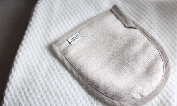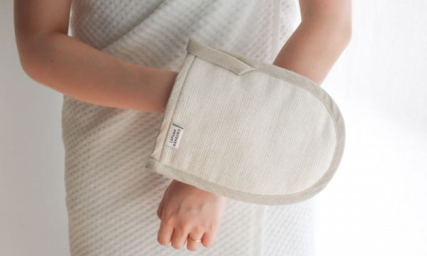 ポケットに手を入れて体を洗うことができる、ウォッシュミトン。片面はパイル地、もう片面はフラットな仕様になっています。特にパイル地の面は乾いているときは固く、ざらつきのある表面ですが、水を含ませるとくたっと柔らかくなり、優しい肌当たりに変わります。バスルームの中や、お洗濯の際にかけて干すことのできるフックもついていて便利。手で洗っている感覚に近いので、あまり強くこすらず、優しく洗いたい方におすすめです。