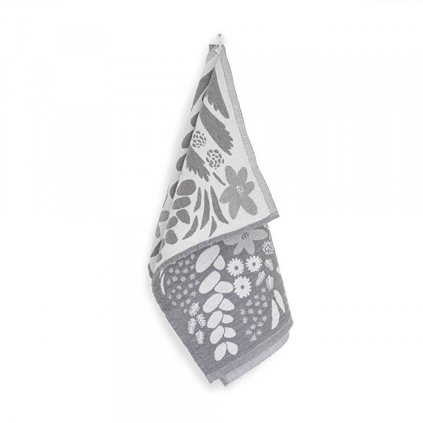 フィンランド語でユーカリを意味する、EUKALYPTUS (エウカリュプトゥス)。テキスタイルデザイナーの氷室友里がユーカリや、ヴァルコヴォッコ(二輪草)、ミモザ、ハルジオン、シロツメクサなどフィンランドにゆかりのある植物をモチーフに、花々を伸びやかに描いたタオルです。フックにかけると、壁に飾られたブーケやスワッグに見えるよう、デザインされています。コットンとリネンで織られた生地は使い始めからやわらかく、かけた際にはその美しいドレープが華やかさをより一層際立てます。インテリアとして、お部屋に飾っても素敵ですが、手を拭いたり、食器を拭いたりなど水回りで使うと手触りだけではないリネンの高い吸水性と撥水性を実感することができます。生花やドライフラワーを贈るような気持ちで、誕生日や結婚祝いなどにいかがでしょうか。