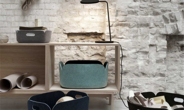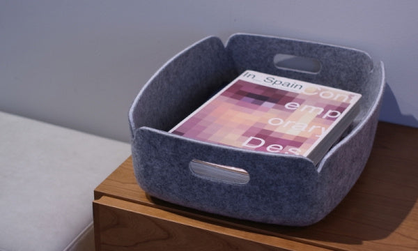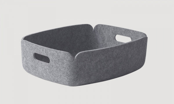 RESTORE(レストア)という名前は、「リサイクル」の意。ペットボトルをリサイクルした頑丈な芯材の表面をポリマーフェルトで覆い、優しい質感をプラス。とても丈夫なため雑誌やおもちゃなどのほか、薪などの重い物を入れることも可能です。軽量さに加え、柔らかくカーブしたフォルムとハンドルにより、持ち運びも便利。ほどよいサイズ、馴染みやすいカラーはインテリアを選ばず、様々な場所で気軽に使えます。浅めなトレイは小物や書類などを入れたり、隙間収納等にも最適なサイズです。