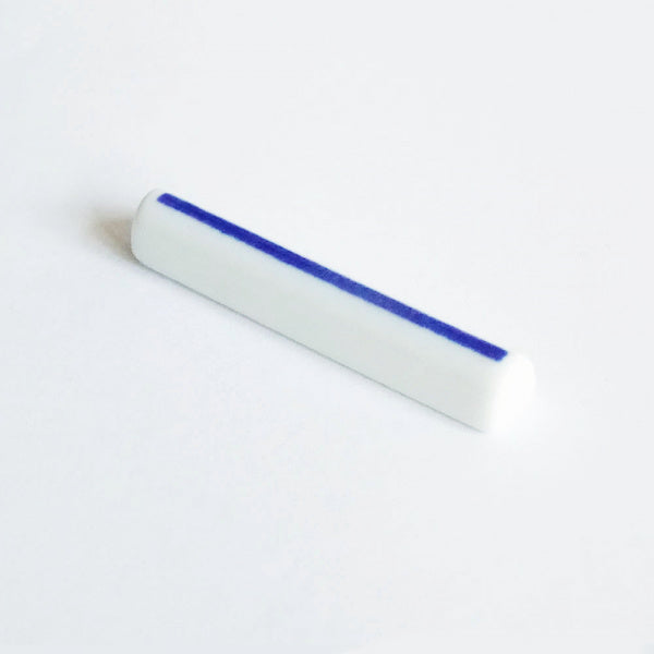 終止符や句読点、飾り罫線など、印刷で使われる「約物(やくもの)」という記述記号をモチーフにしデザインされた箸置きです。「印判」とは、模様を和紙に呉須で写し、水に濡らした筆でそれを素焼きの生地に染めつけ、釉薬をかけて焼成するやり方です。幕末や明治期には、この手法で青い柄の磁器が大量生産されましたが、手仕事ゆえに稀少なものになりかけていました。この箸置きでは、一点一点微妙に違う印判ならではのニュアンスを味わっていただくべく、細部まで工夫を凝らしました。 つややかな白い生地は、国産の陶石を使用した、波佐見焼。転写した模様の上にかけた釉薬の透明感が、美しさを一層引き立てています。