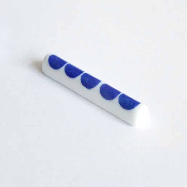終止符や句読点、飾り罫線など、印刷で使われる「約物(やくもの)」という記述記号をモチーフにしデザインされた箸置きです。「印判」とは、模様を和紙に呉須で写し、水に濡らした筆でそれを素焼きの生地に染めつけ、釉薬をかけて焼成するやり方です。幕末や明治期には、この手法で青い柄の磁器が大量生産されましたが、手仕事ゆえに稀少なものになりかけていました。この箸置きでは、一点一点微妙に違う印判ならではのニュアンスを味わっていただくべく、細部まで工夫を凝らしました。 つややかな白い生地は、国産の陶石を使用した、波佐見焼。転写した模様の上にかけた釉薬の透明感が、美しさを一層引き立てています。