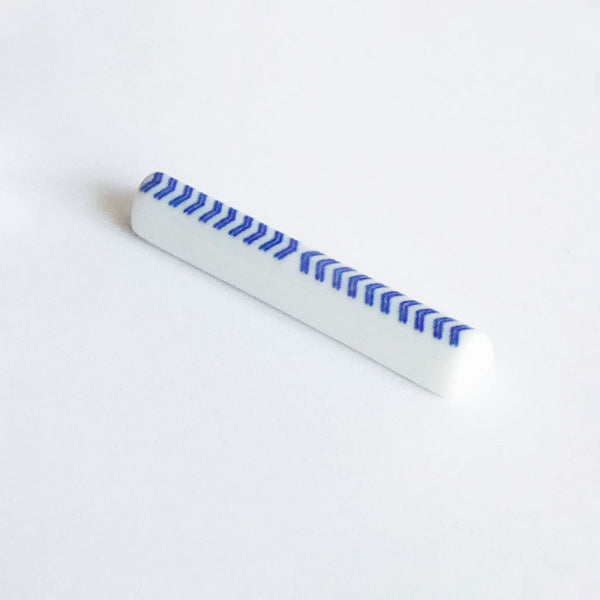 終止符や句読点、飾り罫線など、印刷で使われる「約物(やくもの)」という記述記号をモチーフにしデザインされた箸置きです。「印判」とは、模様を和紙に呉須で写し、水に濡らした筆でそれを素焼きの生地に染めつけ、釉薬をかけて焼成するやり方です。幕末や明治期には、この手法で青い柄の磁器が大量生産されましたが、手仕事ゆえに稀少なものになりかけていました。この箸置きでは、一点一点微妙に違う印判ならではのニュアンスを味わっていただくべく、細部まで工夫を凝らしました。 つややかな白い生地は、国産の陶石を使用した、波佐見焼。転写した模様の上にかけた釉薬の透明感が、美しさを一層引き立てています。