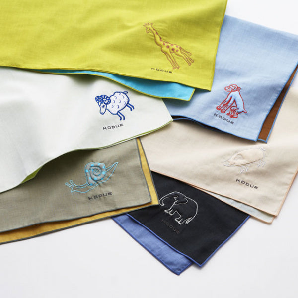 コスチューム・アーティスト「ひびのこづえ」デザインのハンカチです。裏地と表地とで、違う色の薄い布が縫い合わされており、それぞれ、大胆なプリントのもあれば、生地の美しい色を活かしたワンポイントの刺繍のもあります。プレゼントにもお薦めの商品です。