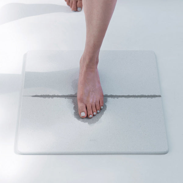 soilの珪藻土は、秋田産と石川県能登産を使用しております。「日本珪藻土日用雑貨製造協会」の厳しい検査基準にも適合しており、アスベストの混入や含有は一切ございません。どうか、この機に、安心安全な日本製珪藻土商品をお使いください。「 珪藻土 」と「 ひる石 」2つの素材配合により、さらに吸水性がアップした"GEM"シリーズのバスマット。 こちらはスクエアタイプのMサイズ。足の裏の水分をすばやく吸い取り、時間がたつと自然に乾燥します。中央の凹みラインにより、吸水面が増え、よりひっつきにくくなりました。【日本珪藻土 日用雑貨製造協会 認定商品】珪藻土:植物プランクトン類の化石、珪藻殻の堆積物によって形成された地層。マイクロメートル単位の微細な孔が無数にある多孔質構造の特性を持っているため、保湿材だけではなく、ろ過助材、吸収材等に利用されています。※ロゴ面をオモテにしてご使用ください。※吸水力が落ちた場合は、紙ヤスリなどでうすくこすると回復します。