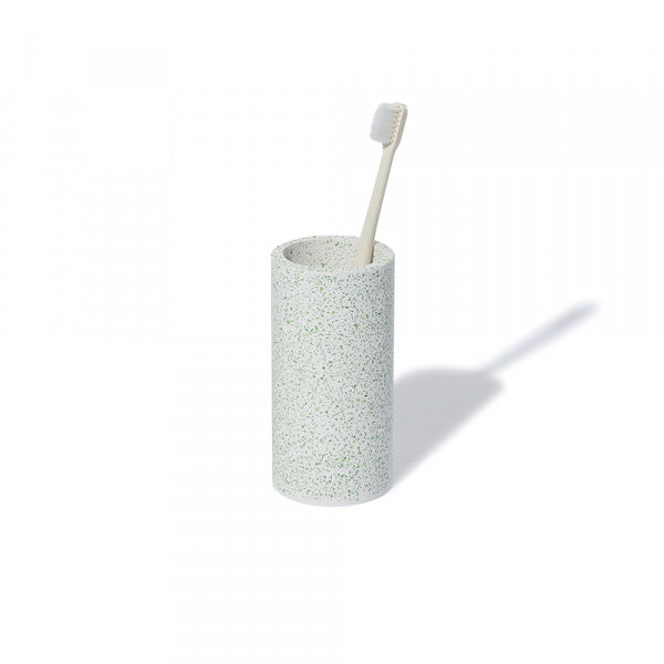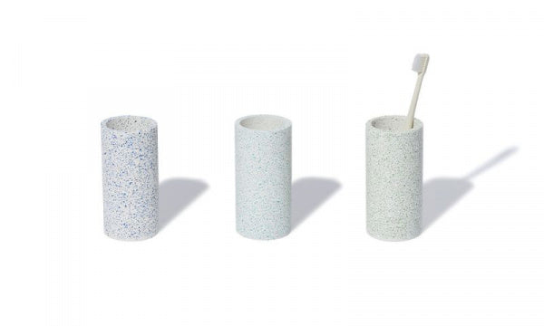 調湿性や吸水、脱臭性に優れ、呼吸する素材としても注目される珪藻土の特性をそのままに、自然の恵みを凝縮させた心地よいデザインが特徴の歯ブラシスタンドです。廃棄されるガラス瓶を砕いた粒を散りばめて、左官の伝統技法「洗い出し」により美しいテクスチャにまで仕上げました。珪藻土が水を吸水して乾燥を早め、洗面台まわりの物を清潔に保ち、永く快適にお使いいただけます。リサイクルガラスの煌めきとどこか懐かしくて新しい風合いが、雰囲気のある空間を演出してくれます。