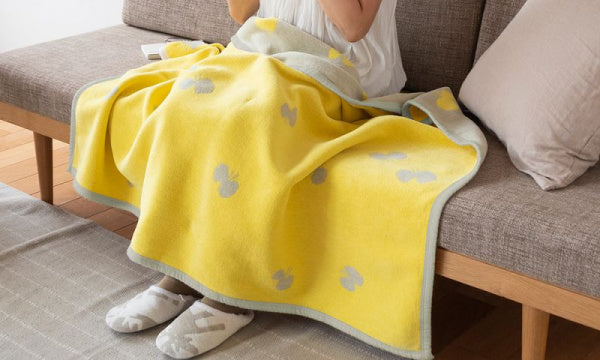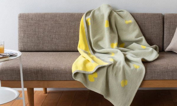 ミナ ペルホネン人気のデザインから、2021年はやわらかなオリーブイエロー が登場しました。優しい色合いのオリーブ、裏面は太陽の日差しのようなイエローの配色で、1枚のブランケットで2つのカラーが楽しめます。冷房は女性が体調を崩す最大の原因になっています。オフィスや自宅の冷房が効く中で、長い時間を過ごす女性にとって、夏ひざ掛けは重要。クリッパン(KLIPPAN)のシュニールコットンのハーフサイズは140×90cm。膝から腰全体まで包みこめると喜ばれています。この上ない肌ざわりの極上シュニールコットンブランットは、ハーフサイズなら2人掛けのソファカバーにもぴったり。クリッパン(KLIPPAN)をソファに掛けるとインテリアのレベルがその瞬間からぐんと上がります。※お洗濯により縮む場合があります。