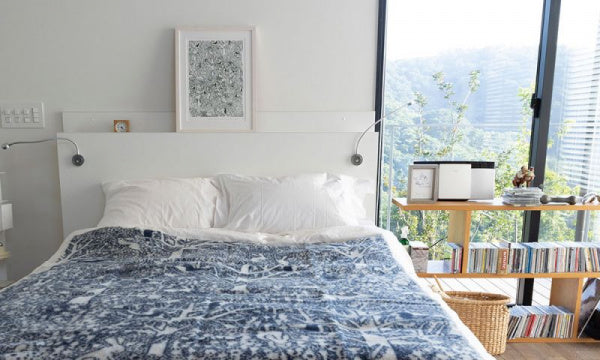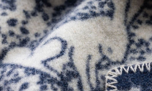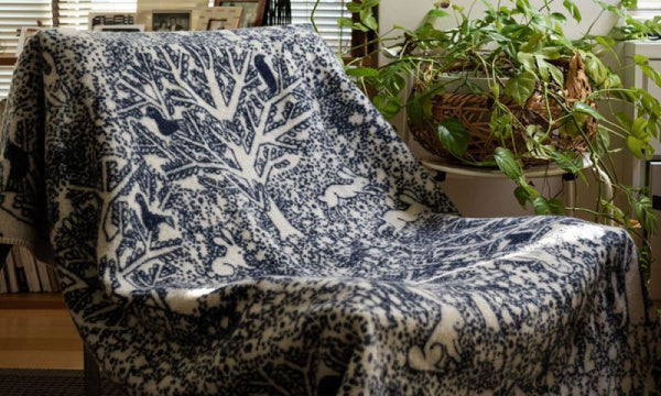 皆川明さんの独創的な世界観、KLIPPANの卓越した織技術のコラボレーションにより実現したアートブランケットは、日本を飛び越え世界中の人々の心をつかみ続け、今では30ヵ国以上で展開されています。コラボレーション10周年を迎える2023年、KLIPPAN哲学「Nature First」に呼応した「rabbits play birds rest -forest-」。『輝く森に遊ぶウサギたち、羽を休める鳥たち』深く輝く森の中を楽しそうにはしゃいでいるウサギたちと木々にとまり羽を休める鳥たち。温もりの中で安堵する気持ちと日々の喜びを謳歌する気持ちの共存する世界を描いています。※水洗い不可