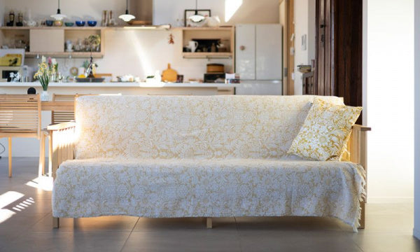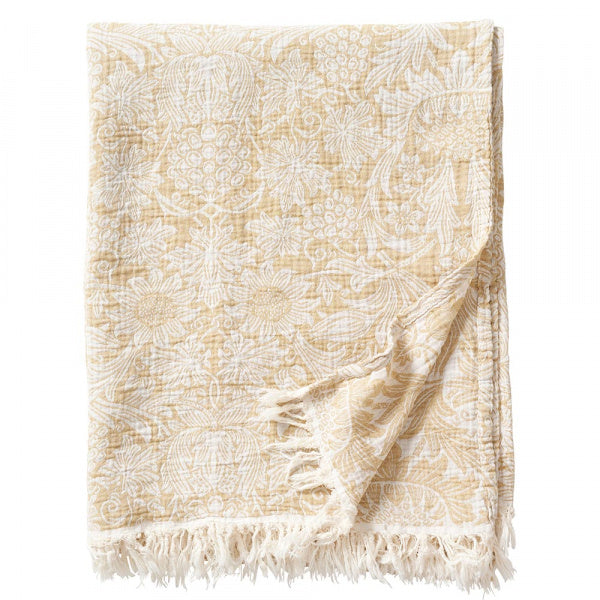 ガーゼのように薄くて軽く、ちぢみ織りのように凹凸がある織りのコットンスロー。肌に密着しないので夏の肌掛けに適しており、極暑の夏に快適な眠りを届けてくれます。夏のアウトドアや海辺で水着の上にはおったり、ストールとして、テーブルクロスやソファカバーとしてなど、マルチに活躍します。コットンはBCI認証※を取得しているサスティナブルな糸を選び、薄手の織りを得意とするポルトガルで作られています。デザインは140年を越えて長きにわたり世界中で愛されている、ウィリアム・モリスのサンフラワー(ひまわり)が繊細な曲線で描かれています。※BCI(Better Cotton Initiative)認証:持続可能なコットンの生産を目指すヨーロッパのNGO団体。綿花栽培での環境負荷を減らしながら農家の生産性を維持できる活動をしています。2021年時点で世界23ケ国でBCIコットンが栽培され、世界の綿花生産量の23%を占めるまでになりました。※お洗濯により縮む場合があります。※ネットに入れての洗濯をお勧めします。