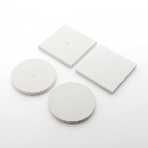 soilの珪藻土は、秋田産と石川県能登産を使用しております。「日本珪藻土日用雑貨製造協会」の厳しい検査基準にも適合しており、アスベストの混入や含有は一切ございません。どうか、この機に、安心安全な日本製珪藻土商品をお使いください。吸水性が高く、グラスの水滴を吸い取ります。テーブルにキズがつかないよう、底面にはシリコン加工を施しています。サークルとスクエアの2タイプ。2枚入りです。 ビアグラスなどに最適な大きめサイズで吸水力も上がっています。【日本珪藻土 日用雑貨製造協会 認定商品】珪藻土:植物プランクトン類の化石、珪藻殻の堆積物によって形成された地層。マイクロメートル単位の微細な孔が無数にある多孔質構造の特性を持っているため、保湿材だけではなく、ろ過助材、吸収材等に利用されています。※吸水量の限界を超えると水がしみ出す場合がございます。※氷を入れた飲み物を長期間置いた場合、コースター自体が冷えて結露が出る場合がございます。