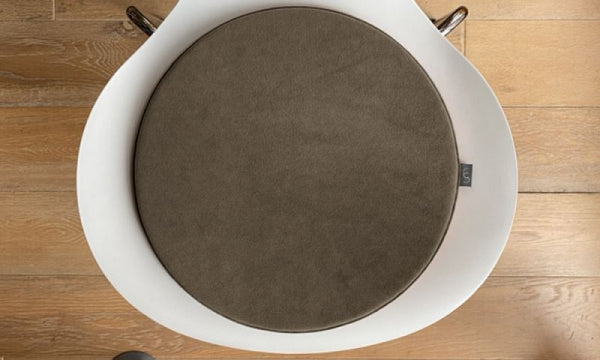 セブンチェア、イームズチェア、アルテックチェアなど全てのデザインチェア、ベンチにフィットする、センプレオリジナルのチェアクッションです。裏表と色違いのウルトラスエード(スエード調人工皮革)を使用しているので、しっとりとした肌触りが心地よく、耐久性などがとても優れています。中材には高密度ウレタンを使用し、置くだけで快適な座り心地を実現します。「SOIL/ソイル」:土、粘土、珪藻土などの大地を想わ せるアースカラー。