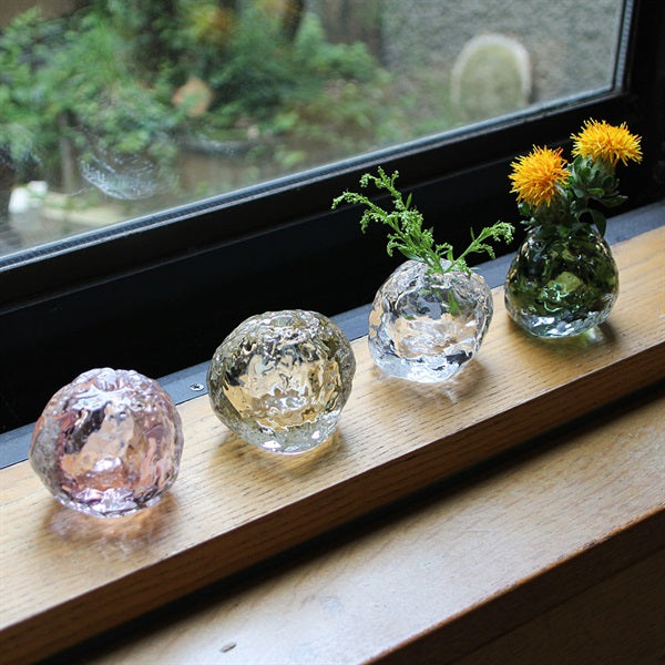 まるで石ころのような、でも実はガラス。手のひらにころんとおさまる一輪挿し「ガラコロ」は、小さいけれどキラリと光る、さりげない存在感が魅力です。カラーは、透明感が美しいクリアー、温かみのあるタン、深みあるバイオレット、そして自然を感じるフォレストグリーンの4色。道端の石ころのそばに咲いた、野の花のような素朴な可愛さを。お好きな場所に、さりげなく。ふと目に入るたび、ちょっと嬉しくなる、そんな風景をそっと作ってくれるアイテムです。一輪挿しとしてはもちろん、デスクのペーパーウェイトや、小さなオブジェとしても楽しめる、"ころん"と愛らしい、手のひらのガラスです。※製法上、形に個体差があり、また道具跡が残ることがあります。