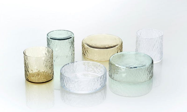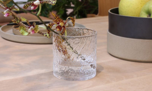 木の丸太をガラスで表現した器です。側面の木肌のように見える表情や底の年輪模様は職人が手彫りで型を彫り、そこにガラスを流し込んで作られています。フォレとは、フランス語で森を意味します。グラスや花器として、またキャンドルホルダーにもおすすめ。高さのあるプレートとしてフィンガーフードをのせたりすることもできます。※リサイクルカラーはいろいろな色のガラスくずを混ぜ合わせて溶かすため、1点ごとに違いが生じます。あらかじめご了承ください。※溶けきらない物質により様々な模様や、細かな気泡が入ります。