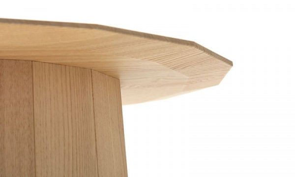 樽のような脚や15角形の天板など、カラーウッド(Color wood)の特徴そのままに、クリの明るい木調が際立つナチュラルな仕上げにまとめました。ベースとなる部分は、日本古来の技法「雇い実接ぎ(やといさねつぎ)」を応用し、台形にカットされたパーツを独特な樽形状となるようにつなぎ合わせて構成されています。