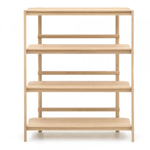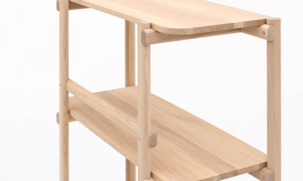 本や雑誌、CD やレコードなどをあまり持たなくなったデジタル時代、アーカイブシェルフは個人が収集したアイテムを長く安全に保管するためのプラットフォームです。私たちが日々の生活で使用し、眺めて思い出したいものを収納、ディスプレイするための家具です。カリモクの熟練の職人の手によって、国産のナラ材で作った細い部材と棚板で組み立てられています。美しく仕上げられたディテール、上品な接合部、柔らかな曲線でアーカイブシェルフは、どの部屋に置いても中心的な存在になるはずです。
