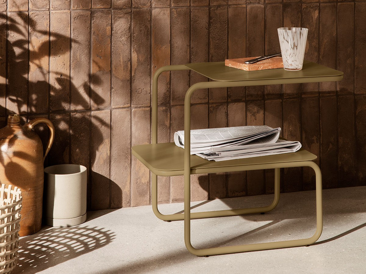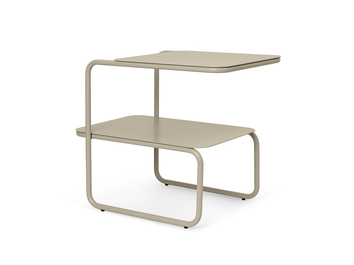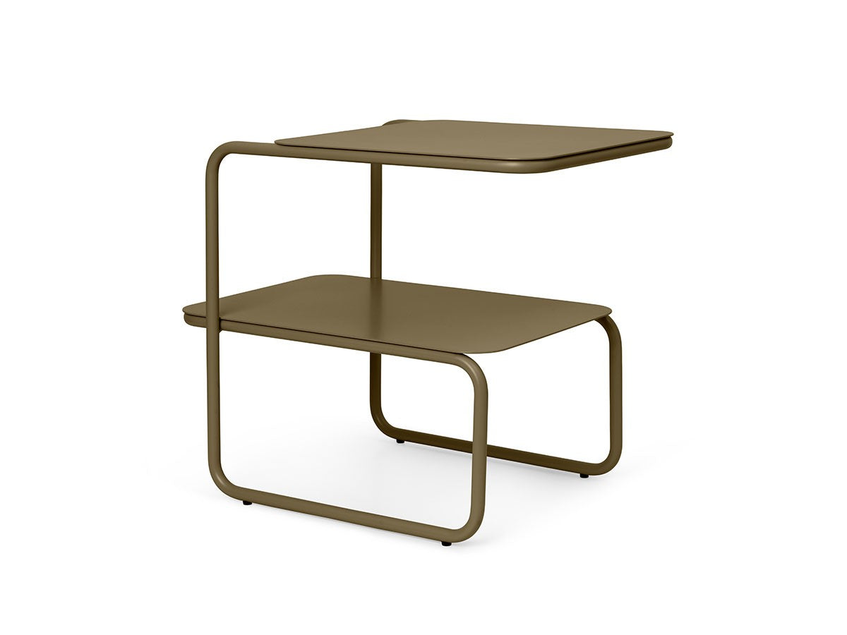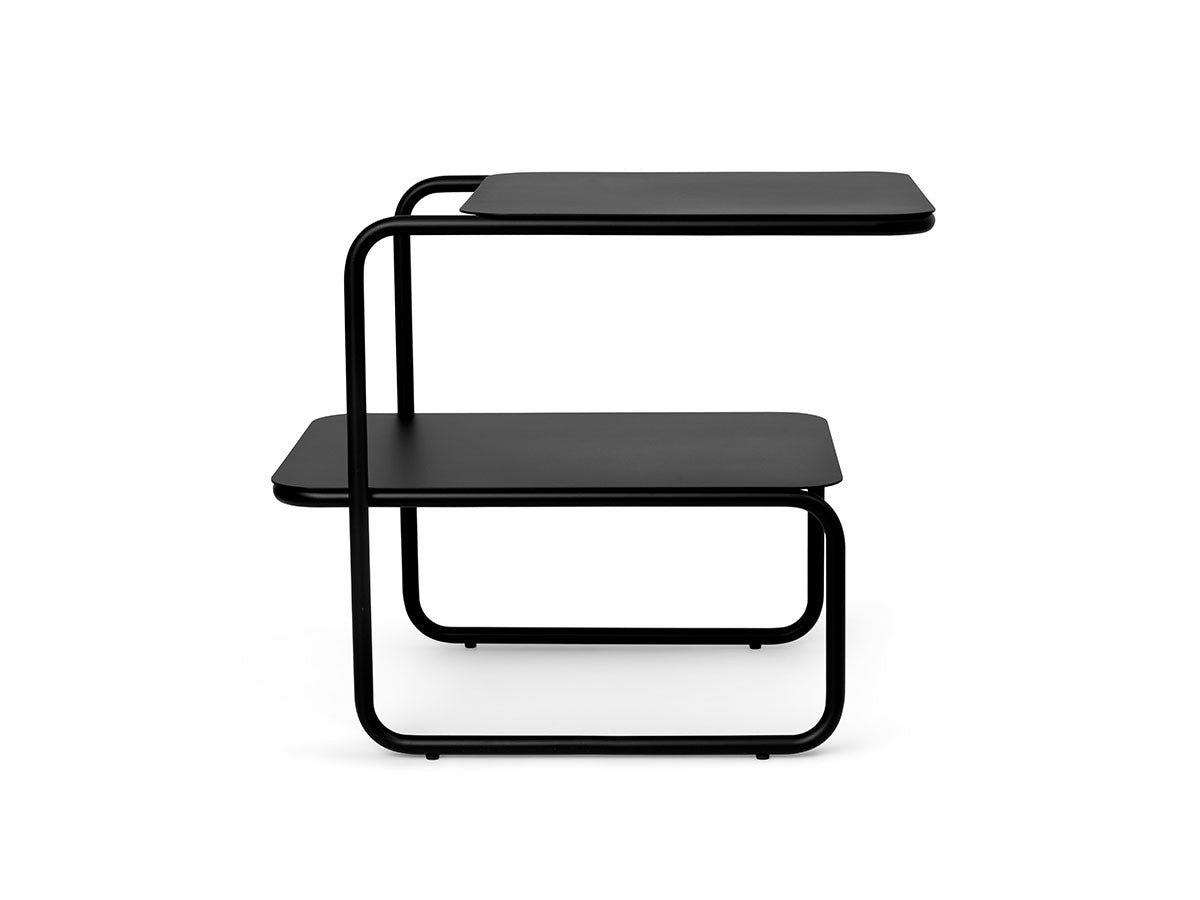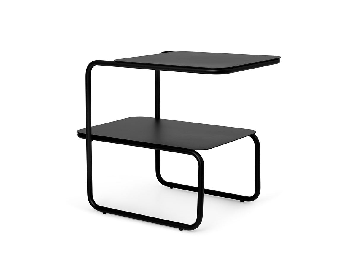 アシンメトリーな形状が魅力的なサイドテーブル。1本のラインが描き出す美しいフレームとわずかにずらした2枚の天板が、ユニークでモダンなシルエットを生み出しています。省スペースでも使いやすい、無駄のないすっきりとしたフォルムです。2段分の収納力があり、上段にはグラスなどすぐ手に取るものを、下段には書籍や雑誌などを置くことができます。上段と下段の天板をずらして配置していることで、下段にはカラフェなど背の高いアイテムも置くことができます。パウダーコーティングされたスチール製で、ベランダやテラスなど屋内外を問わずお使いいただけます。お気に入りの植物を飾るスペースとしても適しています。