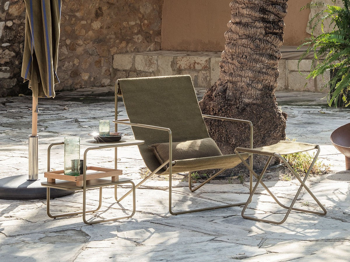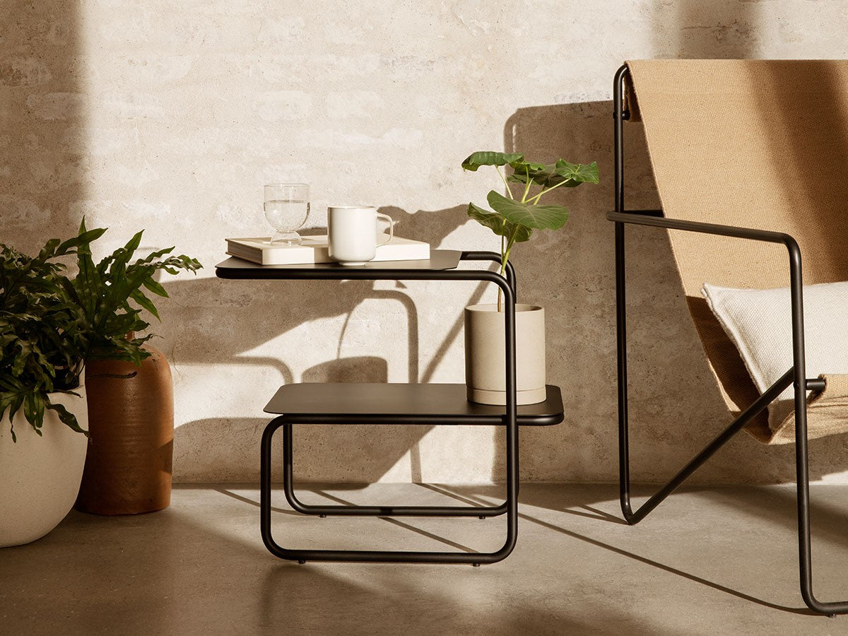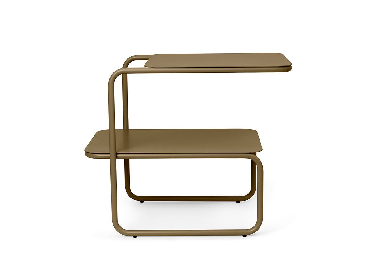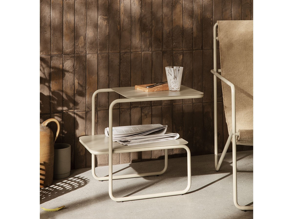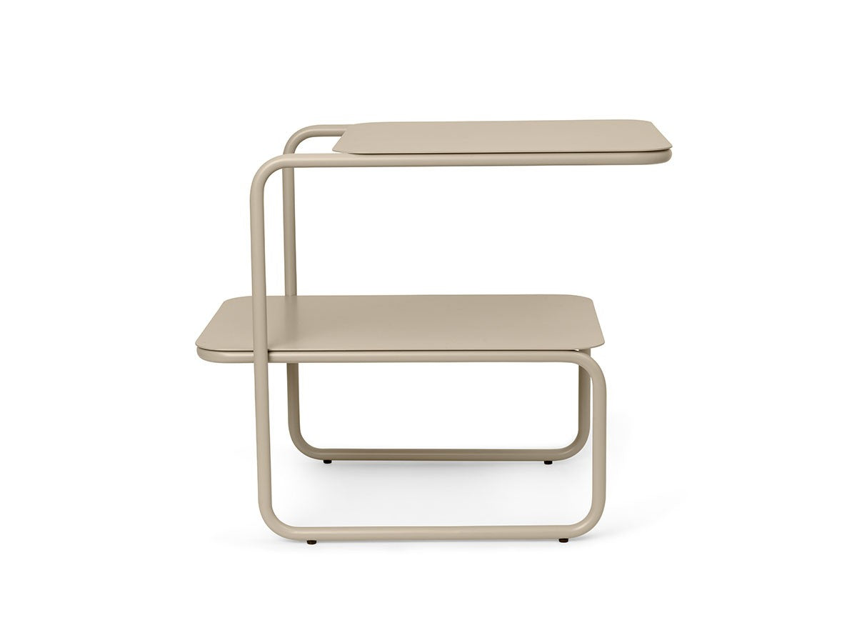 アシンメトリーな形状が魅力的なサイドテーブル。1本のラインが描き出す美しいフレームとわずかにずらした2枚の天板が、ユニークでモダンなシルエットを生み出しています。省スペースでも使いやすい、無駄のないすっきりとしたフォルムです。2段分の収納力があり、上段にはグラスなどすぐ手に取るものを、下段には書籍や雑誌などを置くことができます。上段と下段の天板をずらして配置していることで、下段にはカラフェなど背の高いアイテムも置くことができます。パウダーコーティングされたスチール製で、ベランダやテラスなど屋内外を問わずお使いいただけます。お気に入りの植物を飾るスペースとしても適しています。