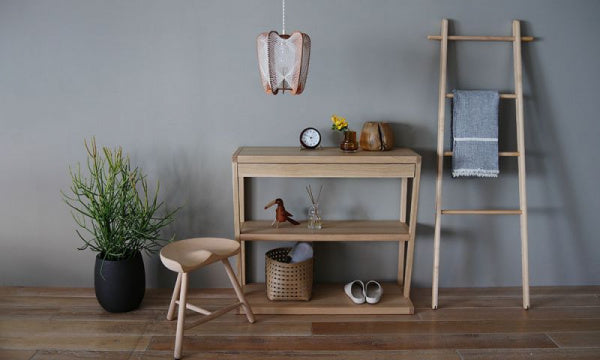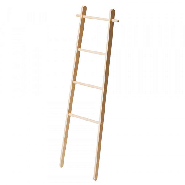 壁に立て掛けるタイプのラックです。メープル材のなめらかな質感、両側の脚の緊張感とやわらかさを両立した美しいフォルム・・・、比べてください。脚の両端には、クッションと滑り止め、そして意匠の役割を果たすゴム付き。湿ったバスタオルなんかも掛けられるよう、ウレタン塗装で仕上げました。