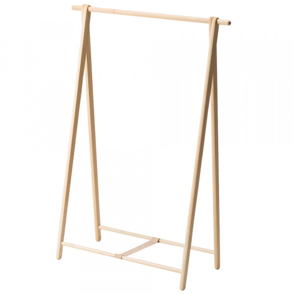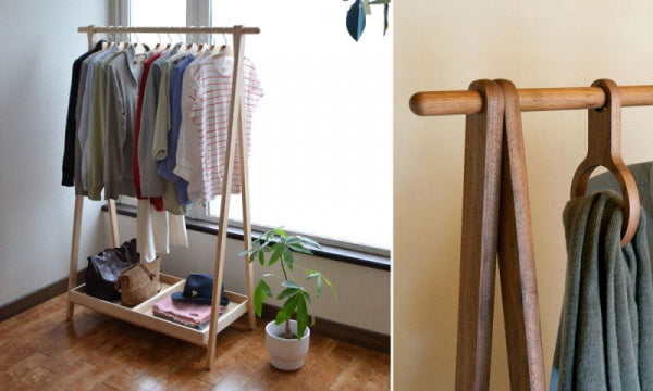 発売から25年以上、今も変わらぬ人気のコサインの顔ともいうべきドレスラックです。たたんで移動できる身軽さ、どこに置いてもシンプルで飽きのこない美しいデザインと素材感が特徴です。脚は緩い曲面で面取りしていますので、見た目も手に触れるときにもやさしい感触です。脚先は、丸く面取りしているので畳にも。バーに渡した牛革のベルトなど細部にもこだわっています。オプションでフックやトレーも用意していますので、身の回りの物を一箇所にまとめてすっきり収納できます。薄着の洋服で27~29着着程掛けられます。
