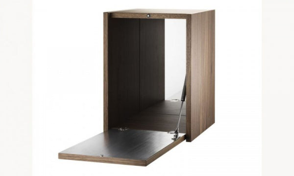 タイニーキャビネットは幅28x奥行き30x高さ38cmのワンサイズです。String Systemのワイヤーパネル奥行き30cmに組み合わせ可能です。木製シェルフまたはキャビネット類の上に設置し、ワイヤーパネルに取り付けて使用します。蓋の内面は艶消しステンレススチール仕上げ、内側奥はミラー仕上げです。組立式。