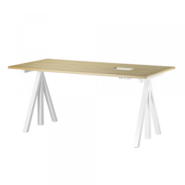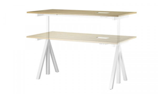 ストリングの昇降式デスクはステッピングモーター機能により、ボタンひとつで高さ715~1185mmのお好みの位置に調節できます。立ったり座ったりしながら仕事をしたり、一人ひとりの体格に合わせた 高さでデスクを使え、仕分けや物の整理をする際は、作業に最適な位置で効率よく進められます。前後のないデスクなのでミーティング用に、または自宅のダイニングテーブルとしても違和感はなく、簡単な会議なら立ったまま、仕事が終わってちょっとしたカクテルパーティーを開く際にはバーカウンターとしてもオススメです。パーテーションや引き出しをオプションで取り付けることが可能です。