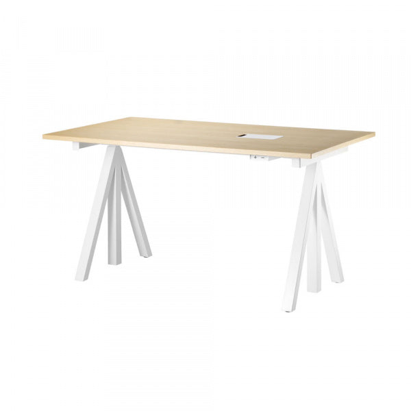 ストリングの昇降式デスクはステッピングモーター機能により、ボタンひとつで高さ715~1185mmのお好みの位置に調節できます。立ったり座ったりしながら仕事をしたり、一人ひとりの体格に合わせた高さでデスクを使え、仕分けや物の整理をする際は作業に最適な位置で効率よく進められます。前後のないデスクなのでミーティング用に、または自宅のダイニングテーブルとしても違和感はなく、簡単な会議なら立ったまま、仕事が終わってちょっとしたカクテルパーティーを開く際にはバーカウンターとしてもオススメです。パーテーションや引き出しをオプションで取り付けることが可能です。