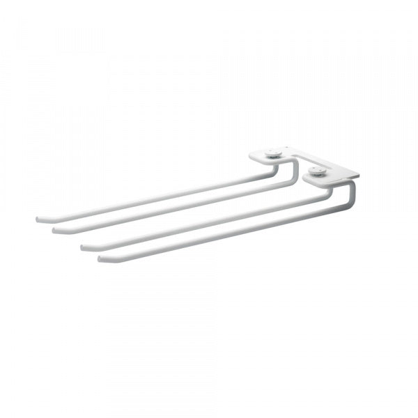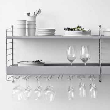 【メタルシェルフに取り付けできます。】グラスハンガーはメタルシェルフまたはガルバナイズドのシェルフに付属させて使うアクセサリーです。1個に2レーンついていて、各パッケージ2個入りです。シェルフの奥行き20cmと30cm用の2種類のサイズがあり、リムの直径7cmの場合、奥行き20cmのものには1レーンに2-3個、奥行き30cmのものには3-4個のワイングラスが収納できます。幅58cmのメタルシェルフには3個まで、幅78cmのメタルシェルフには4個まで設置可能です。