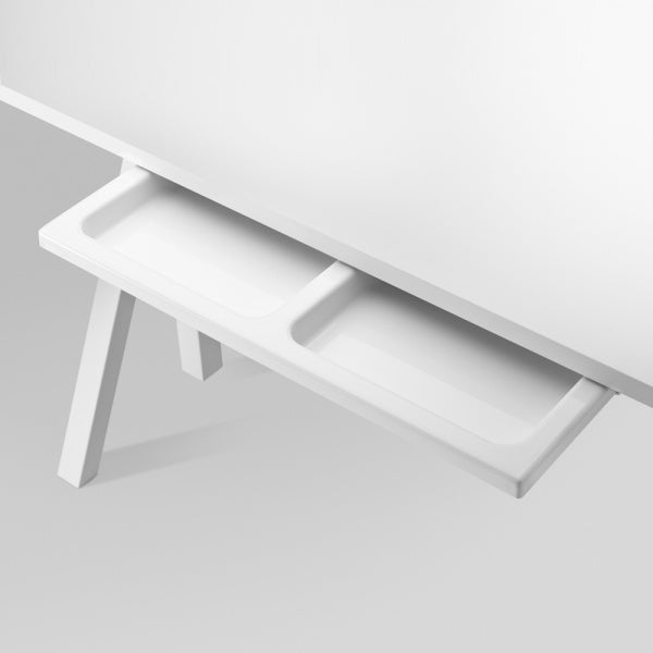 ワークデスクのための専用ドロワー(引き出し)です。 テーブルトップの下に取り付けます。深さ約2センチの浅目が意外と便利な引き出しです。スッキリデザインのデスクにも、見た目邪魔しないサイズ感です。