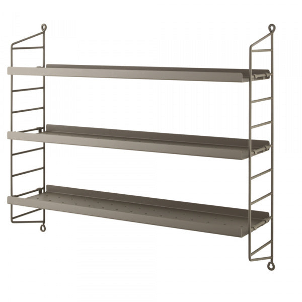 メタル製のストリングポケット。ストリングのJフックやレールを付属させると、より汎用性が高まります。サイドパネル2枚、シェルフ3枚、木ネジ(5cm)4個のセット。シェルフの耐荷重:25kg・棚板には左右があり、金具同士の間隔が広い方が向かって左側です。・表面の細かな傷、裏面など目立たない箇所の傷は良品とさせていただく場合がございます。・壁がコンクリート、石膏ボードの場合は、アンカーを壁に差込み、ネジで固定します。石膏ボード用アンカー付き。