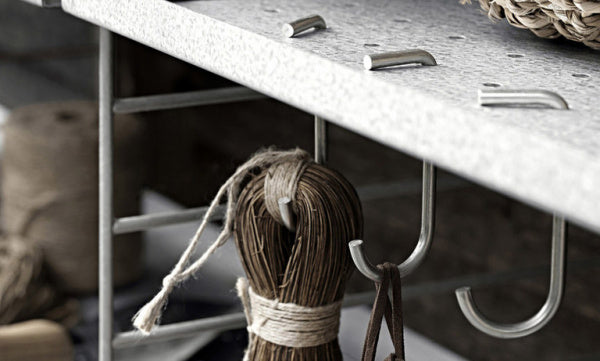 Jフックはシェルフの機能をさらに高めるためにデザインされたアクセサリーで、メタルシェルフおよびガルバナイズドのシェルフに取り付けることができます。アウターやバッグを掛けたり装飾品をディスプレイするのにも使えます。各パッケージ5個入りです。