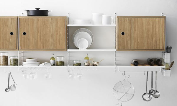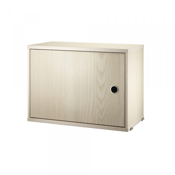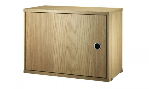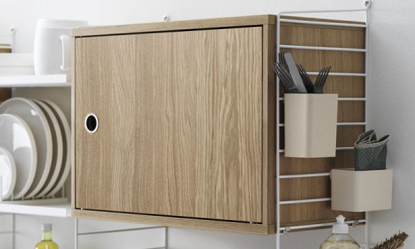 片開きキャビネットは幅58cm、奥行き30cmのワンサイズです。String Systemの奥行き30cmのサイドパネルに取り付け可能で収納力がアップしすっきりと整理整頓できます。扉は左開き右開きどちら側にも取り付けることができ、高さ調整可能なシェルフ1枚がついています。内寸は幅54cm、奥行き26cm、高さ38cmです。組立式。