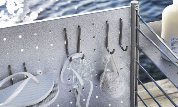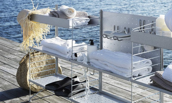ガルバナイズド製のフレームは屋外用のフリースタンドシェルフのパーツです。ガルバナイズドのフレーム1枚とサイドバー2本に高さ85cmのフロアパネル2本とD30cmのシェルフでフリースタンドシェルフを構成します。左右に拡張させるには各セクションにサイドパネル1枚とサイドバー1本が必要です。3つのセクションで構成する場合は少なくともフレーム1枚を真ん中のセクションに配置することをおすすめします。