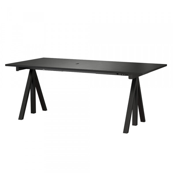 ストリングの昇降式デスクはステッピングモーター機能により、ボタンひとつで高さ715~1185mmのお好みの位置に調節できます。立ったり座ったりしながら仕事をしたり、一人ひとりの体格に合わせた高さでデスクを使え、仕分けや物の整理をする際は作業に最適な位置で効率よく進められます。前後のないデスクなのでミーティング用に、または自宅のダイニングテーブルとしても違和感はなく、簡単な会議なら立ったまま、仕事が終わってちょっとしたカクテルパーティーを開く際にはバーカウンターとしてもオススメです。パーテーションや引き出しをオプションで取り付けることが可能です。