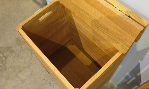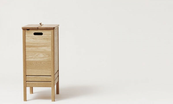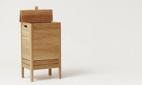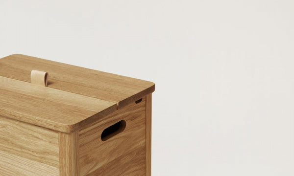 大容量の収納スペースを備えた実用性の高いランドリーボックスです。蓋はレザーの小さなハンドルで持ち上げられ、使用中は蓋が固定される構造になっています。両サイドに持ち手の穴があるので、使用中のボックスを簡単に移動させることができます。 下部にある2本の直線は、ボックス内の空気を自然に換気させる、ランドリーボックスにとって重要な機能を持たせたデザインとなっています。