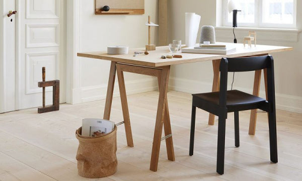 ネスト コルク ペーパーバスケットはシェーカー教徒のデザインに学ぶ趣旨の展覧会用に作成されました。この展覧会は、「家事」と「家事から連想されるもの」をテーマにしたものでした。マガジンラックとして、またスリッパなどのさまざまな日用品を入れるために使えるよう、古典的なシェーカーバケツやバスケットをアレンジしたデザインです。輸送時に平たく梱包できるようにとの配慮から崩れたような外観が特徴的ですが、形状をコントロールするために上下にスプラインを入れ、丸みを帯びた形に仕上げています。横から見ると、よりソフトでテキスタイル的な印象です。手縫いされたコルク生地の二層構造と、スチームで曲げられた木の取っ手が、この製品の全体的な品質と豊かなディテールを際立たせています。