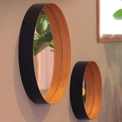 竹集成材の曲げ特性を活かした壁掛けミラーです。横から見ると縁が鏡に映りこみ、筒が浮いているかのような錯覚を与えます。竹は注目のエコ素材で、岡山県倉敷市のTeoriの竹素材加工技術とデザイナーのコラボレーションによって完成した商品です。