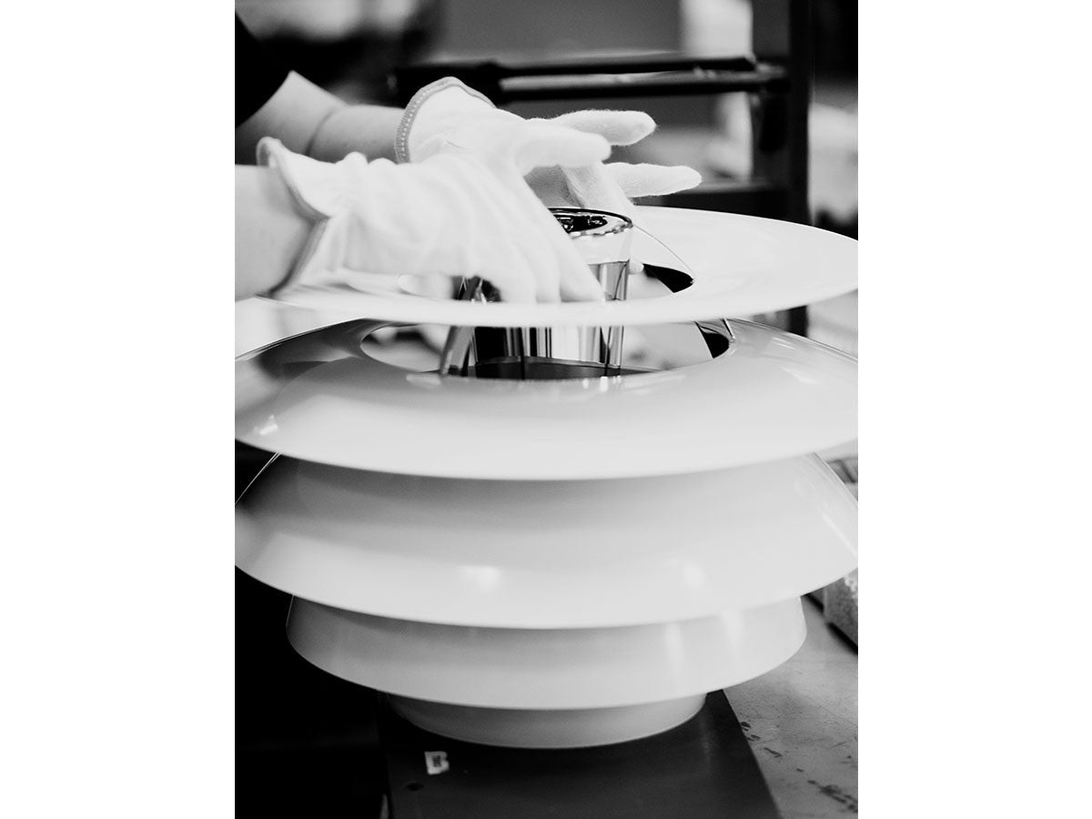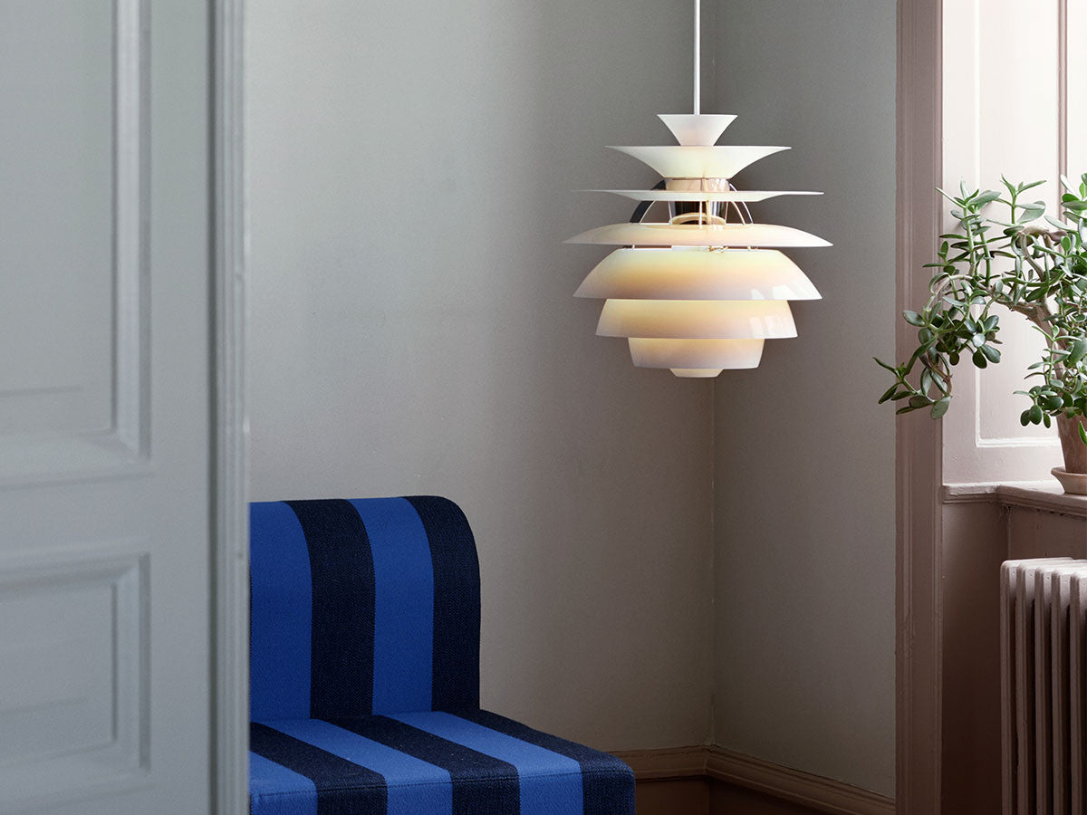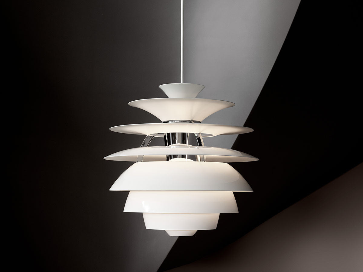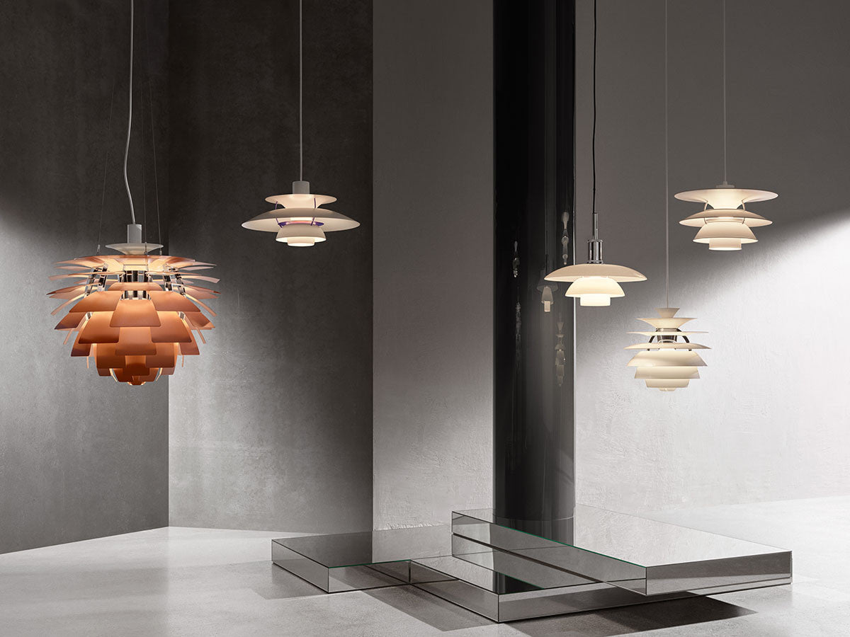 シェードの両面を光沢とマットに塗り分け、美しい光の効果を生み出すペンダント。光源の光はすべてのシェード内面に同じ角度であたり、グレアをまったく生じさせないデザインです。1924年の8枚シェードのランプをリ・デザインして1958年に発表、「PH 5」とともにデンマーク工芸博物館に展示しました。しかしその時点で大きな注目を集めることはなく、1983年になってようやく生産と販売が始まりました。工芸品と呼ぶにふさわしい名品です。
