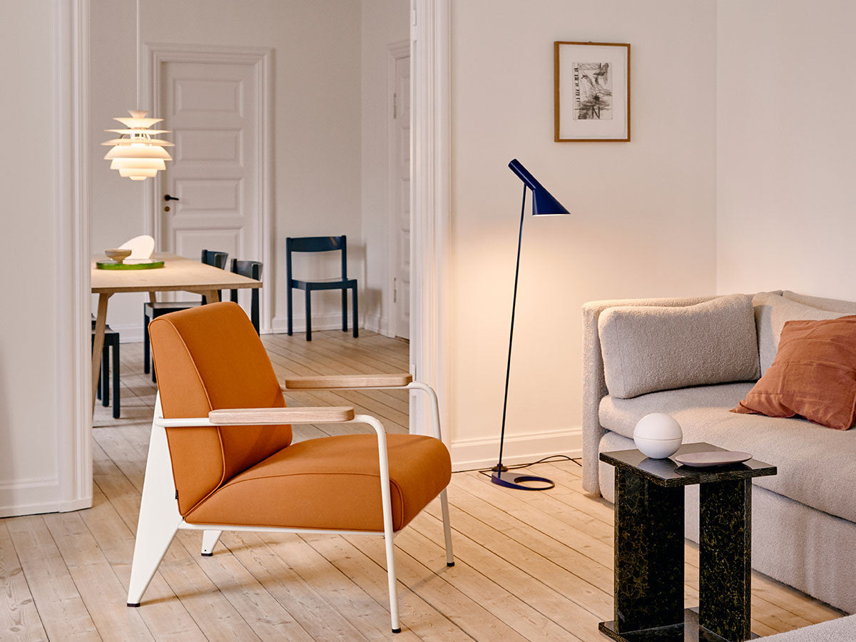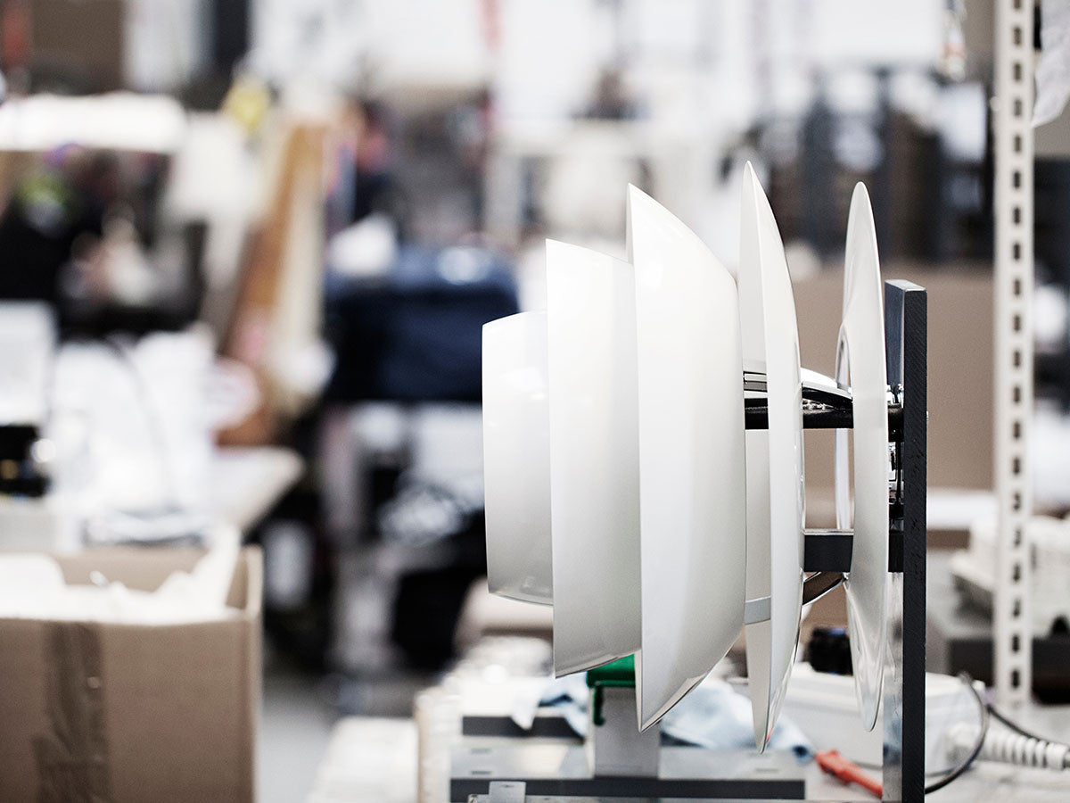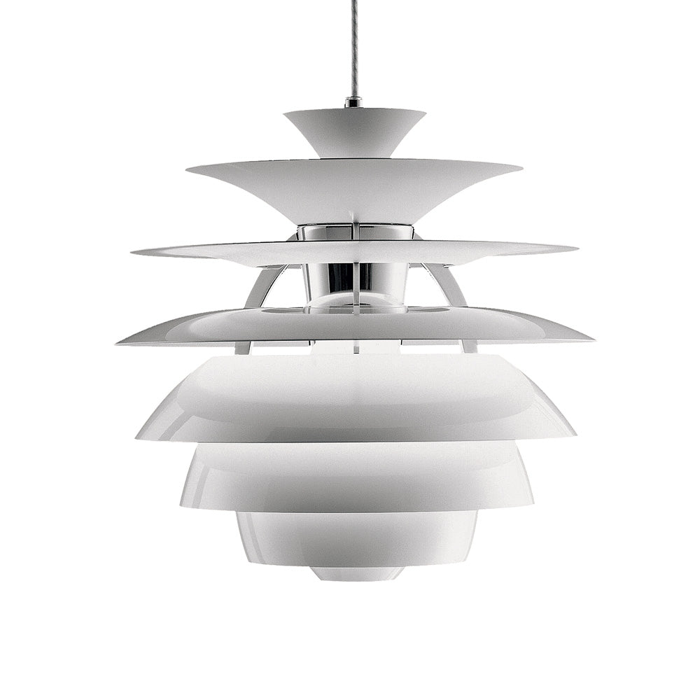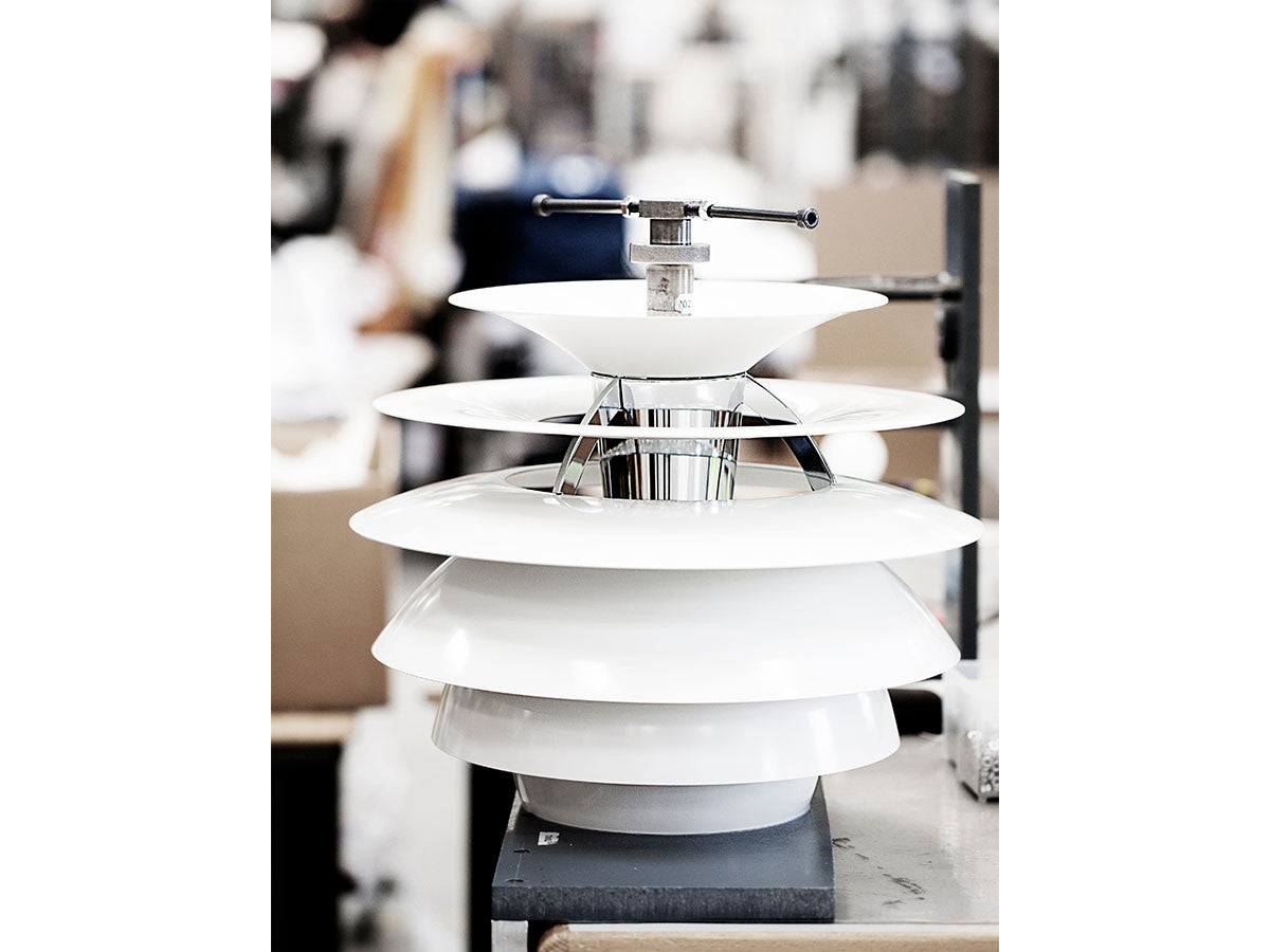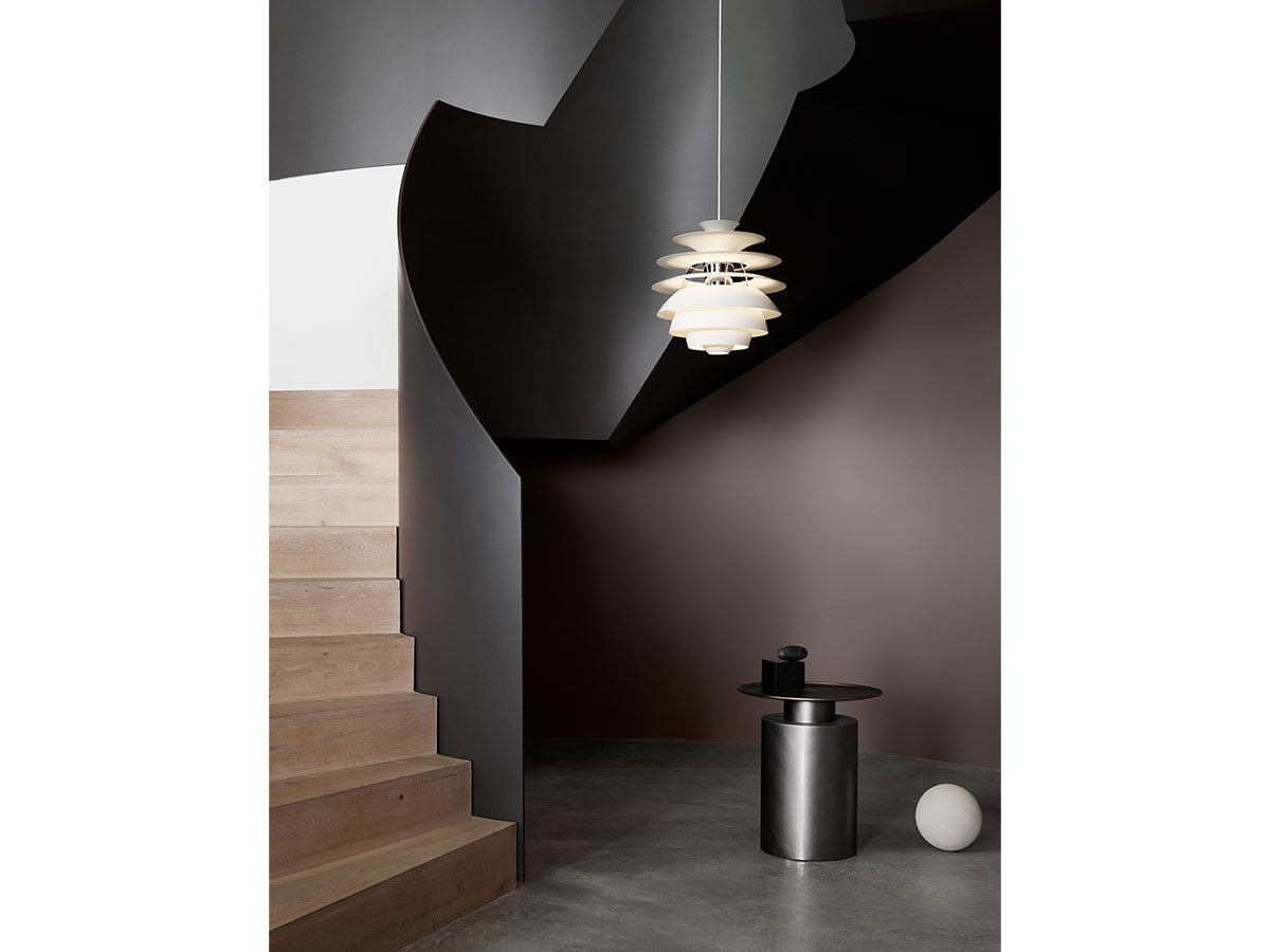 シェードの両面を光沢とマットに塗り分け、美しい光の効果を生み出すペンダント。光源の光はすべてのシェード内面に同じ角度であたり、グレアをまったく生じさせないデザインです。1924年の8枚シェードのランプをリ・デザインして1958年に発表、「PH 5」とともにデンマーク工芸博物館に展示しました。しかしその時点で大きな注目を集めることはなく、1983年になってようやく生産と販売が始まりました。工芸品と呼ぶにふさわしい名品です。