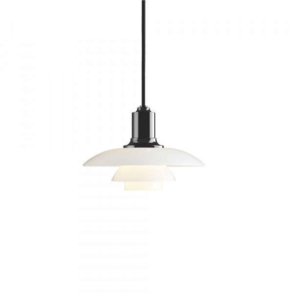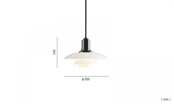 現在製造されている3枚シェードのPHランプのなかで最小のものです。眩しさのない心地よい光を生むために、すべてのシェードの内側をフロスト加工しています。小さいながらも光の特性は秀逸で、ひとや物を柔らかく照らします。テーブルやカウンターなどの上に複数並べて吊り下げるのに適しています。1998年に復刻発売。コードカラー:ブラック