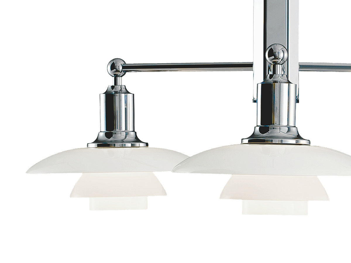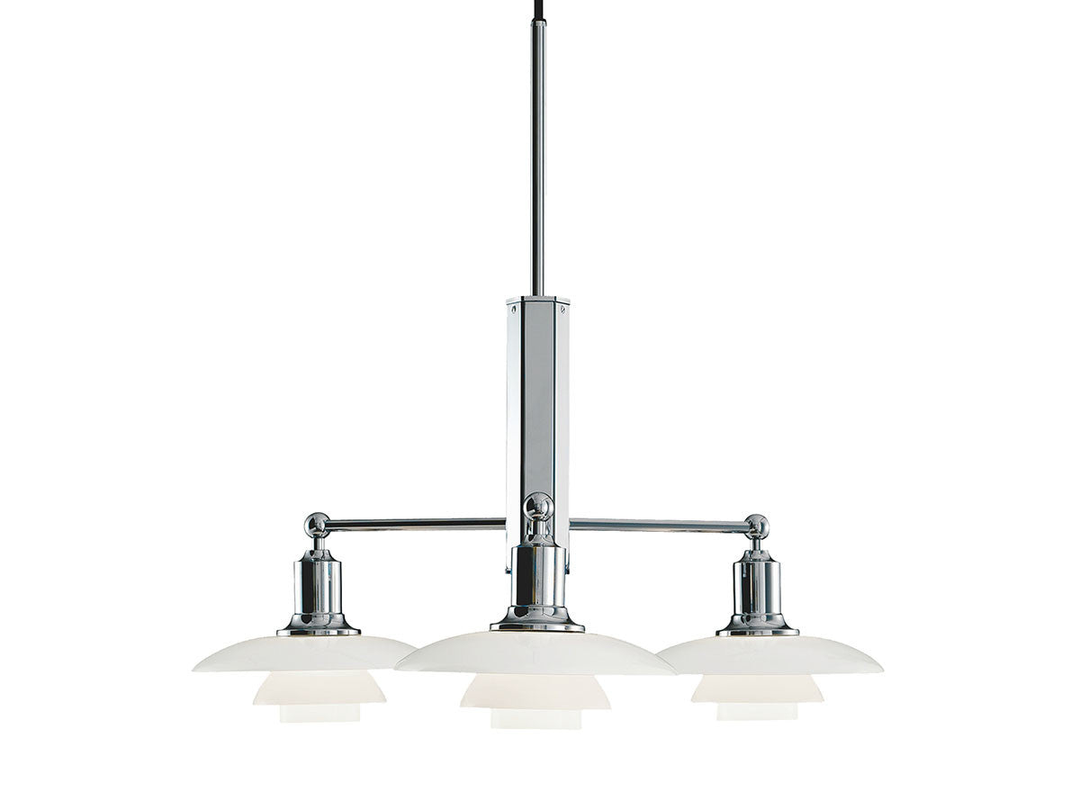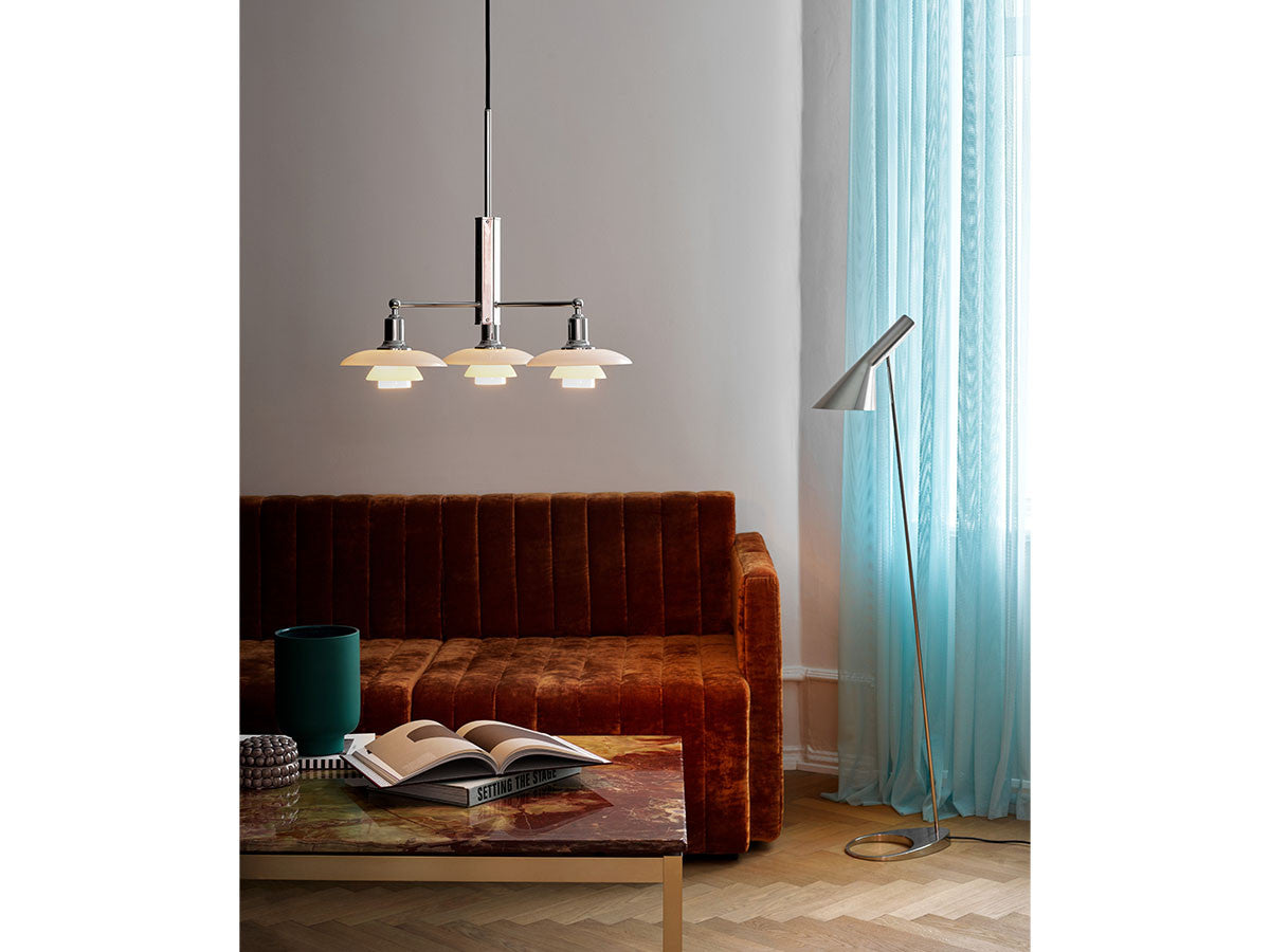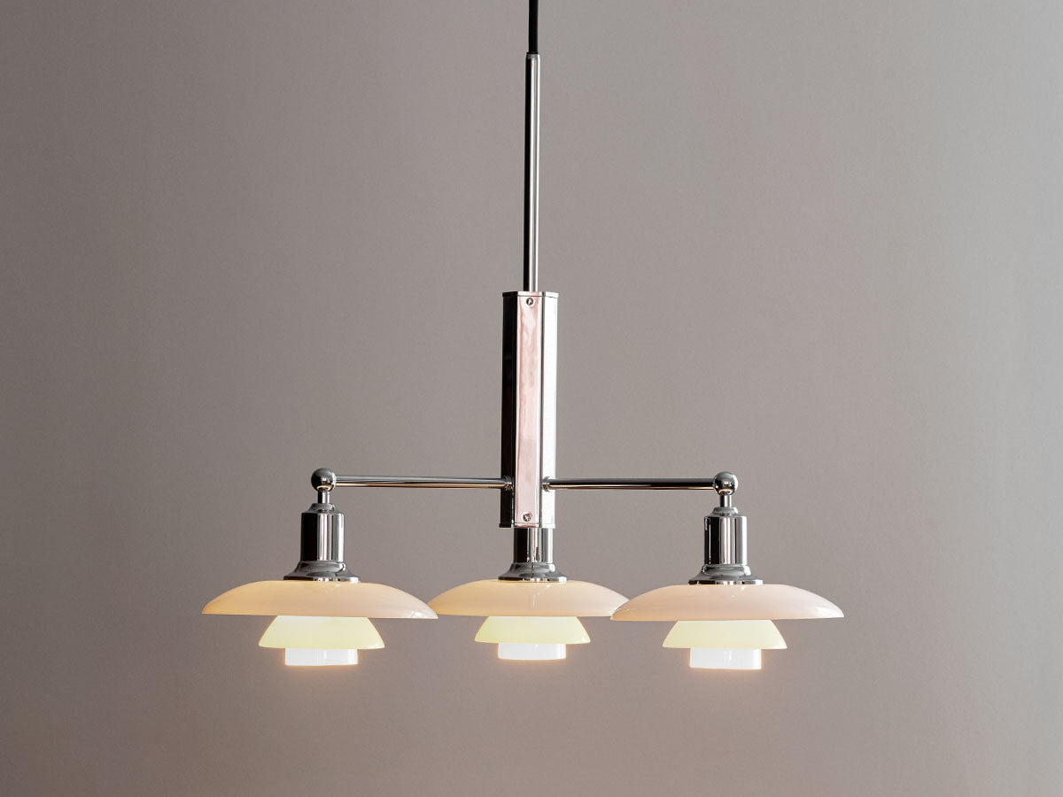 六角形のステム(幹)に、3枚シェードのPHランプを3灯組み合わせたミニシャンデリア。テーブル上にある物を明るく照らし出し、着席した人の顔にも自然な陰影をつける、美しい照明です。ステムタイプのPHランプは1930年代にさかんに製造されたスタイルで、当時のオリジナルは現在では入手困難なコレクターズアイテムとなっています。現行の「PH 2/1 ステム・フィティング」は2003年に発売されました。当時と変わらず、良質なクラフツマンシップが生みだす品位があり、スイッチを入れた時と消した時、両方の状態で空間に上質な雰囲気を与えます。