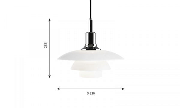 1920年代から30年代初頭のポール・ヘニングセンのオリジナル設計図にもとづくデザインで、彼の有名な『3枚のシェードを使ったPHランプ』のアイディアを忠実に再現。シェードにハンドメイドの吹きガラスを採用したバージョンです。ポール・ヘニングセンは、光学的な計算と試験を繰り返し行いました。シェードのかたちは、そのシェードに光をどのように反射させ、光をどうかたちづくるかを考えて決定されましたが、何よりもまずグレアフリーとなるようにデザインされました。 乳白ガラスのシェードはランプ全体を柔らかく見せ、グレアフリーの光で周囲を照らしますが、これは3枚シェードのPHランプだけが発することのできる光です。各シェードは三層の乳白吹きガラス製で、その外側は光沢がありますが、電球から直接光を受ける内側はサンドブラスト加工をしてマット状になっており、目に心地よいソフトな光を反射して均等に拡散させます。「シェード形状に対数螺旋というカーブを用い、そのシェードを3枚組み合わせて電球の眩しい光(グレア)をカットし、同時に、それらのシェードは光が必要とされる場所・方向に光を効率良く反射して届ける」という、合理的かつ機能的なデザインは、今も価値を失うことなく美しい光を発します。
