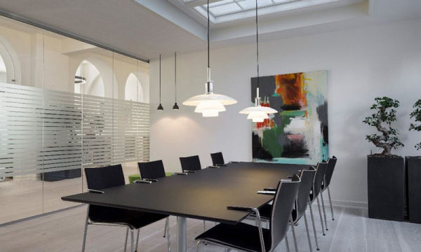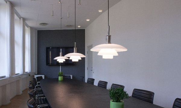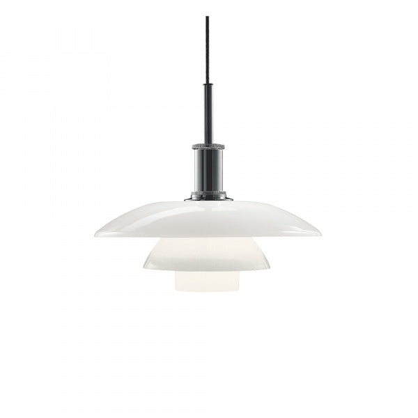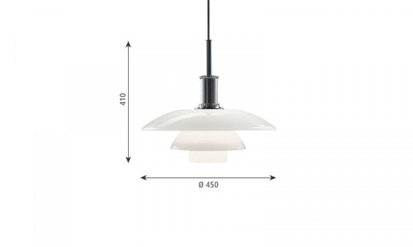 1920年代末のクラシックなPHランプをリ・デザインしたものです。光の質の高さは比類なく、室内に上質な空間をもたらします。光源の光は、フロスト加工されたシェード内面で反射され、効率よく下方に向けられます。上方へは柔らかい透過光を放ち、豊かな光の雰囲気を生みだします。1981年のリ・デザイン時に、発光面積が大きいフロスト電球の眩しさを和らげるため、ブルーグレーに塗装された2枚の内部リフレクターを付け加えました。