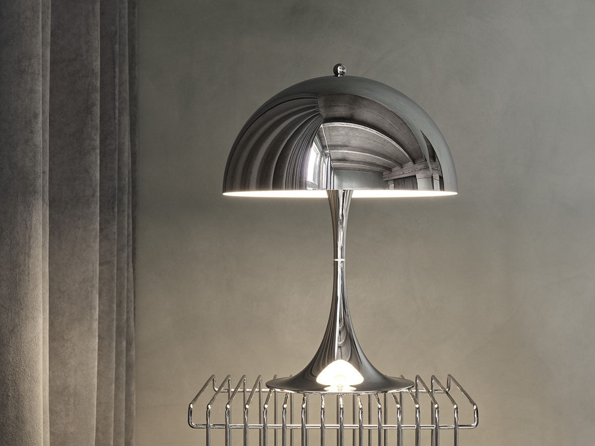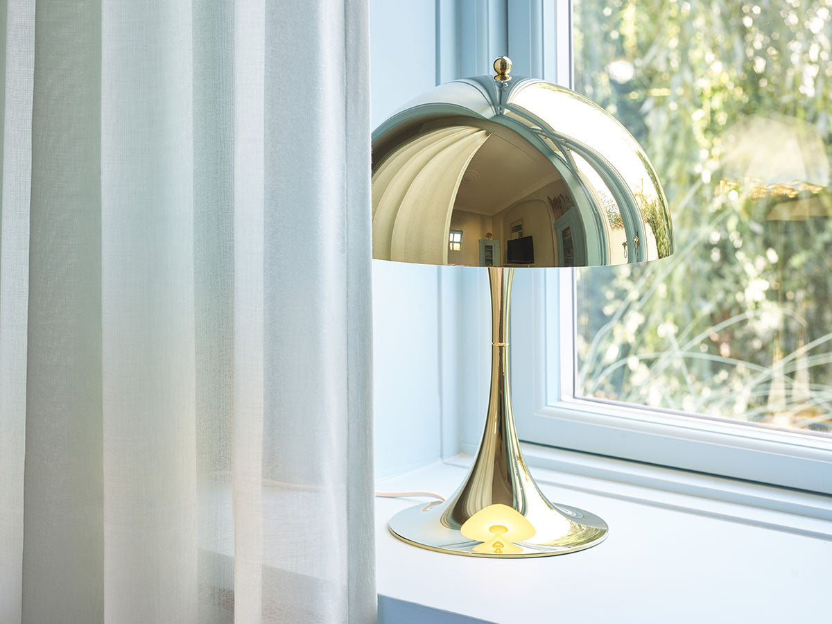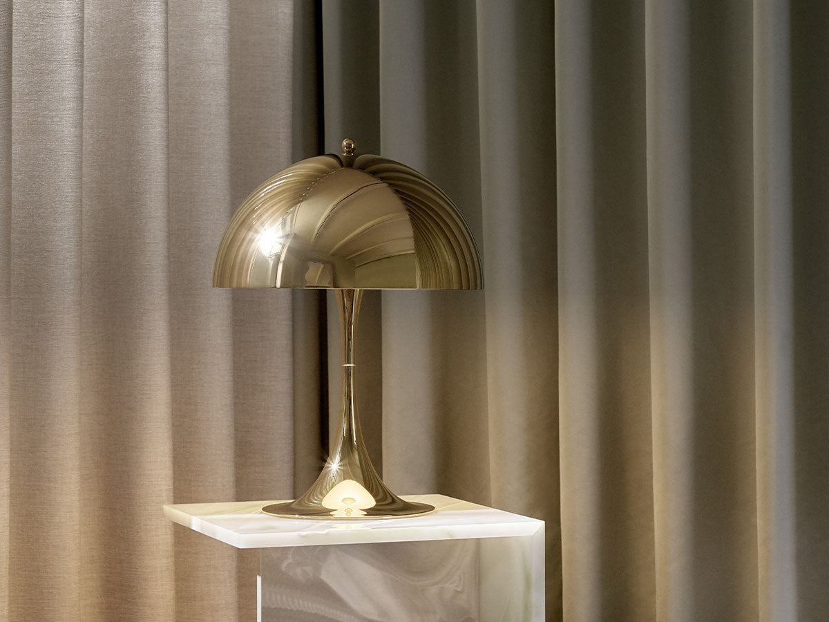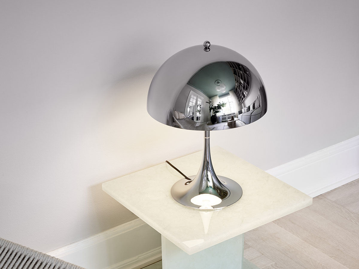 1971年、ヴェルナー・パントンが手掛けた「パンテラ」は、パントンを代表するアイコニックなデザインの一つです。タイムレスな幾何学的フォルムのテーブルランプ「パンテラ テーブル 400」と小ぶりな「パンテラ ミニ テーブル」の中間サイズとなる「パンテラ テーブル 320」は、2020年にリリースされました。素材、色、サイズによらず、明るく躍動感のある曲線のフォルムがインテリア空間を引き立てます。住宅などのプライベートな空間に限らず、店舗、ホテル、バーなどといったオープンな空間にもなじむデザインです。メタル製のシェードは、周囲に光を広げることなく、下向きの光が支柱とベース部分で反射され、アクセントライトとなります。シェード先端とその内部のトランペット形ソケットカバー先端を結ぶ延長線上に電球のフィラメント部分が来るようデザインされており、パントンと個人的にも親しかったポール・ヘニングセンのランプデザインの影響がうかがえます。