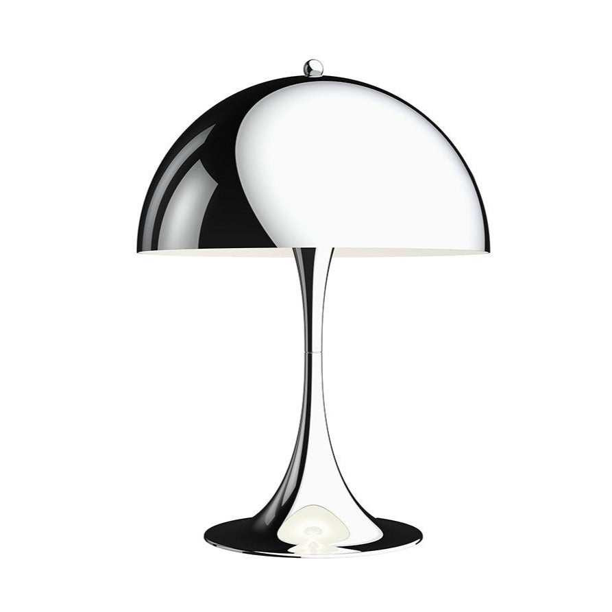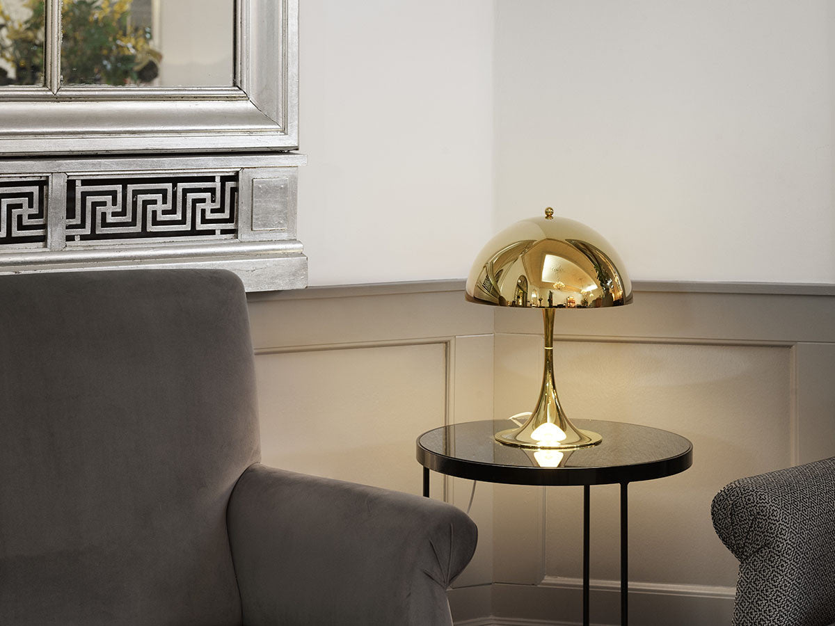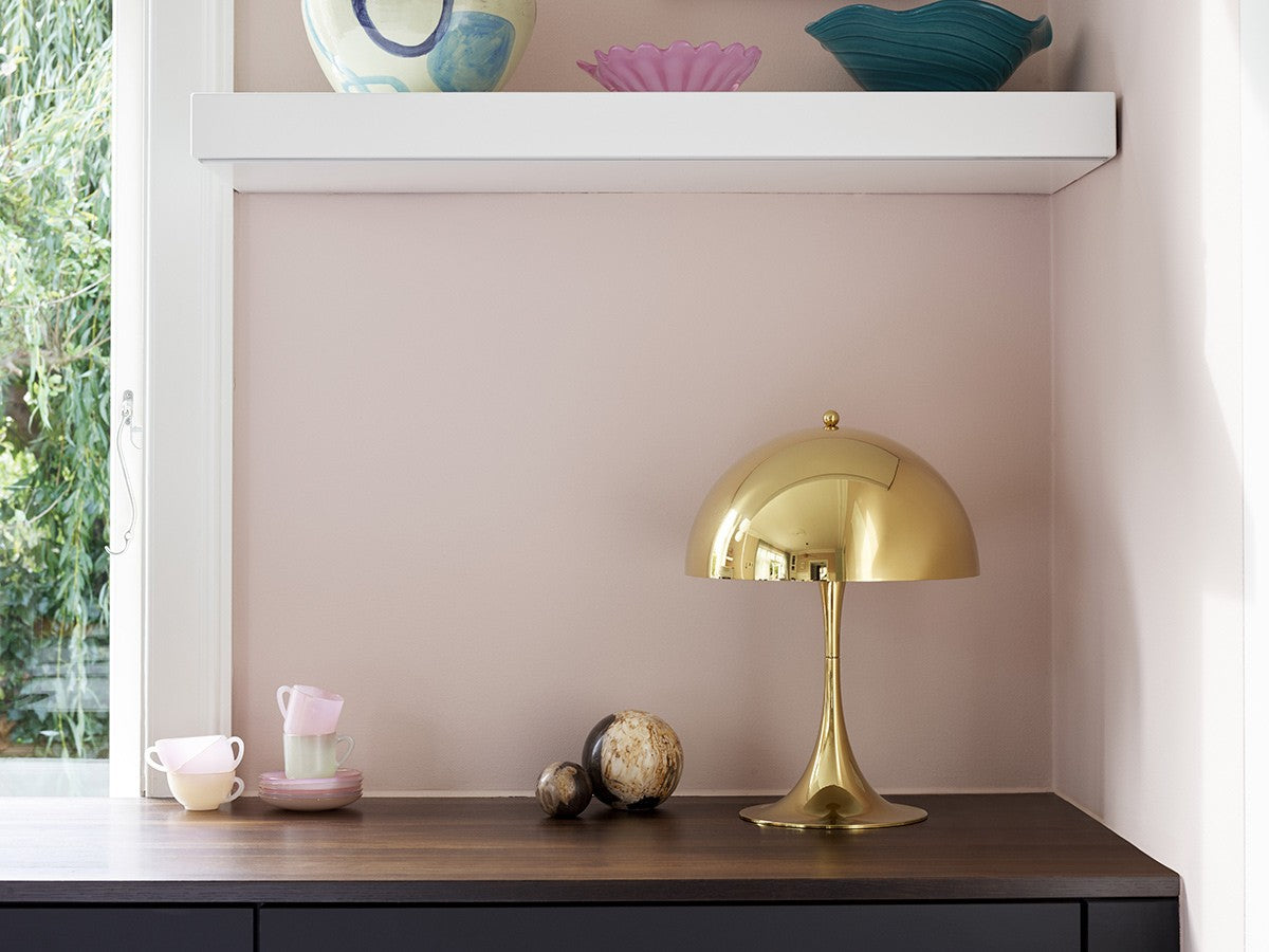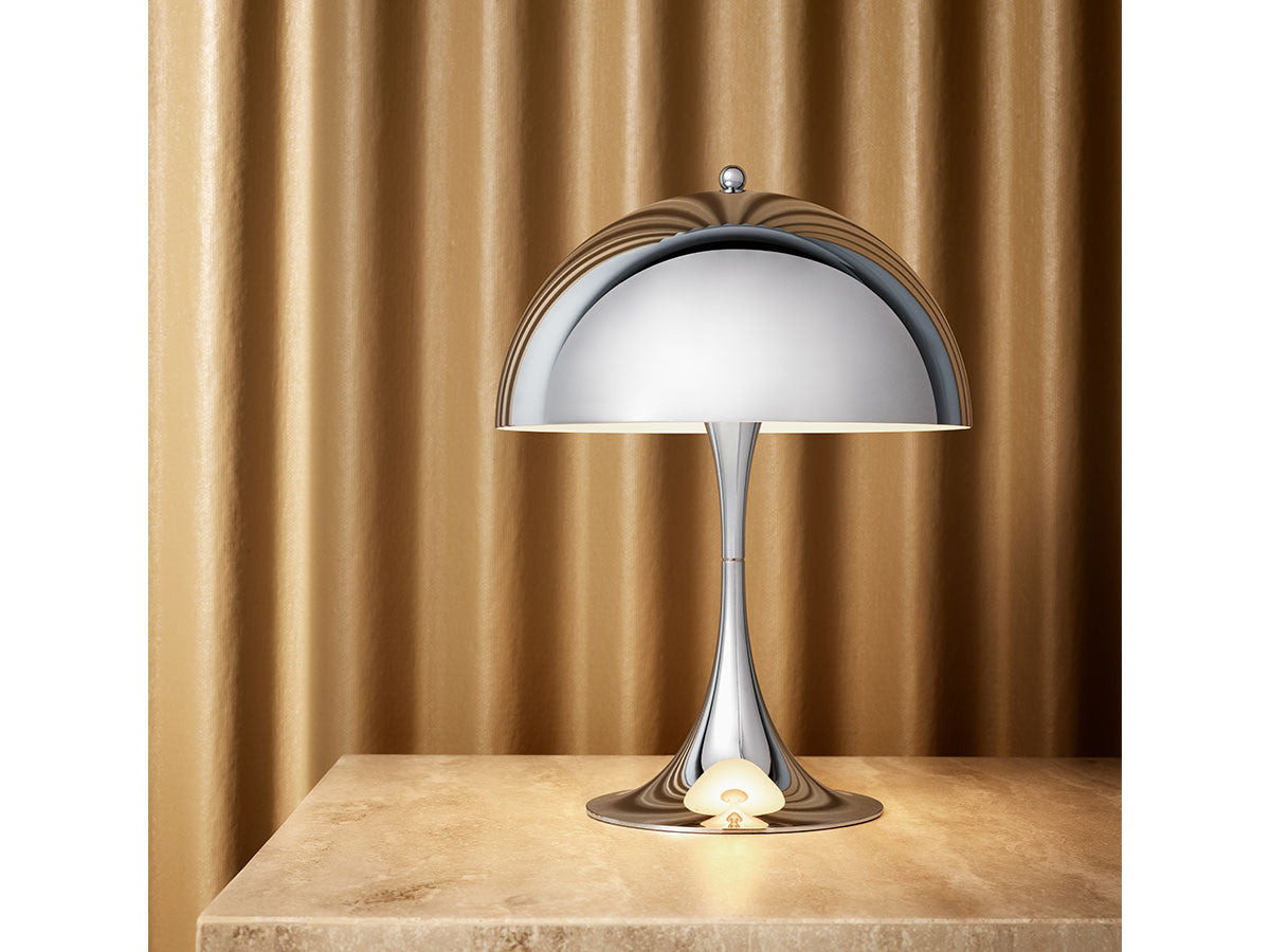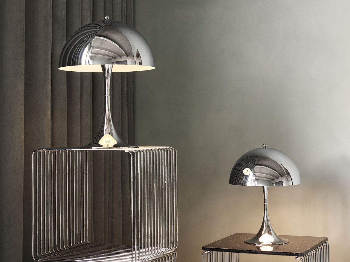 1971年、ヴェルナー・パントンが手掛けた「パンテラ」は、パントンを代表するアイコニックなデザインの一つです。タイムレスな幾何学的フォルムのテーブルランプ「パンテラ テーブル 400」と小ぶりな「パンテラ ミニ テーブル」の中間サイズとなる「パンテラ テーブル 320」は、2020年にリリースされました。素材、色、サイズによらず、明るく躍動感のある曲線のフォルムがインテリア空間を引き立てます。住宅などのプライベートな空間に限らず、店舗、ホテル、バーなどといったオープンな空間にもなじむデザインです。メタル製のシェードは、周囲に光を広げることなく、下向きの光が支柱とベース部分で反射され、アクセントライトとなります。シェード先端とその内部のトランペット形ソケットカバー先端を結ぶ延長線上に電球のフィラメント部分が来るようデザインされており、パントンと個人的にも親しかったポール・ヘニングセンのランプデザインの影響がうかがえます。