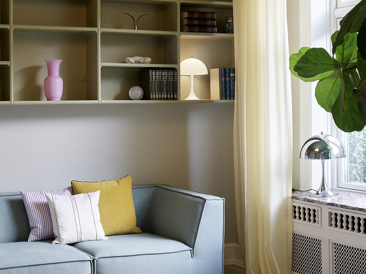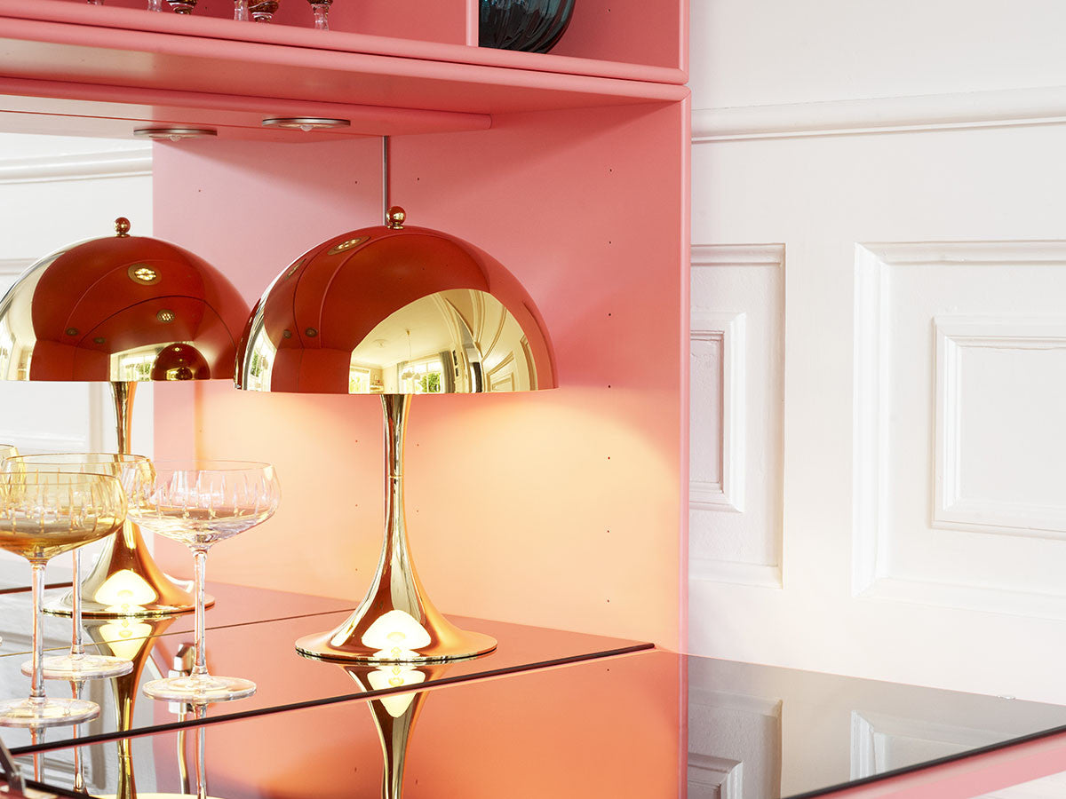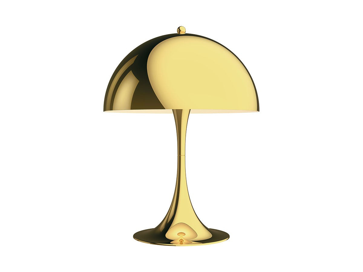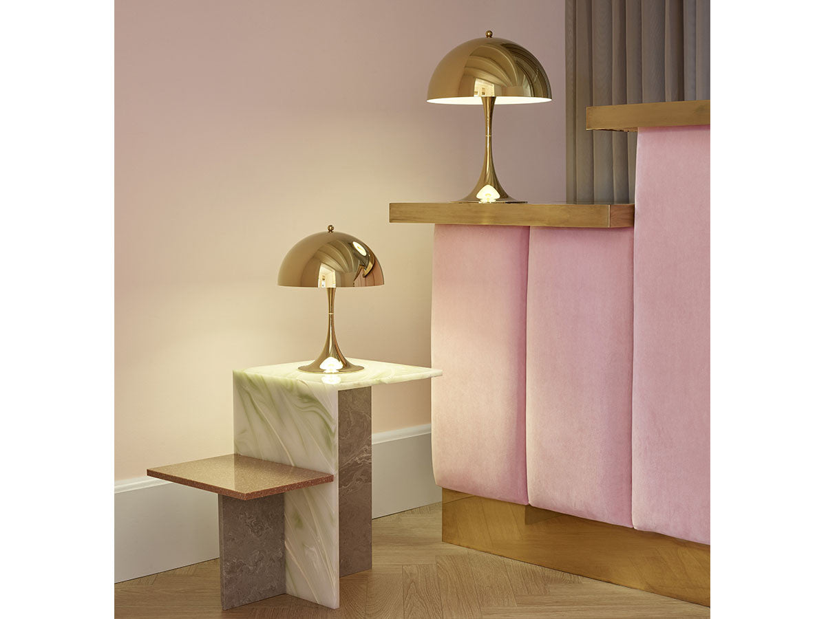 1971年、ヴェルナー・パントンが手掛けた「パンテラ」は、パントンを代表するアイコニックなデザインの一つです。タイムレスな幾何学的フォルムのテーブルランプ「パンテラ テーブル 400」と小ぶりな「パンテラ ミニ テーブル」の中間サイズとなる「パンテラ テーブル 320」は、2020年にリリースされました。素材、色、サイズによらず、明るく躍動感のある曲線のフォルムがインテリア空間を引き立てます。住宅などのプライベートな空間に限らず、店舗、ホテル、バーなどといったオープンな空間にもなじむデザインです。メタル製のシェードは、周囲に光を広げることなく、下向きの光が支柱とベース部分で反射され、アクセントライトとなります。シェード先端とその内部のトランペット形ソケットカバー先端を結ぶ延長線上に電球のフィラメント部分が来るようデザインされており、パントンと個人的にも親しかったポール・ヘニングセンのランプデザインの影響がうかがえます。