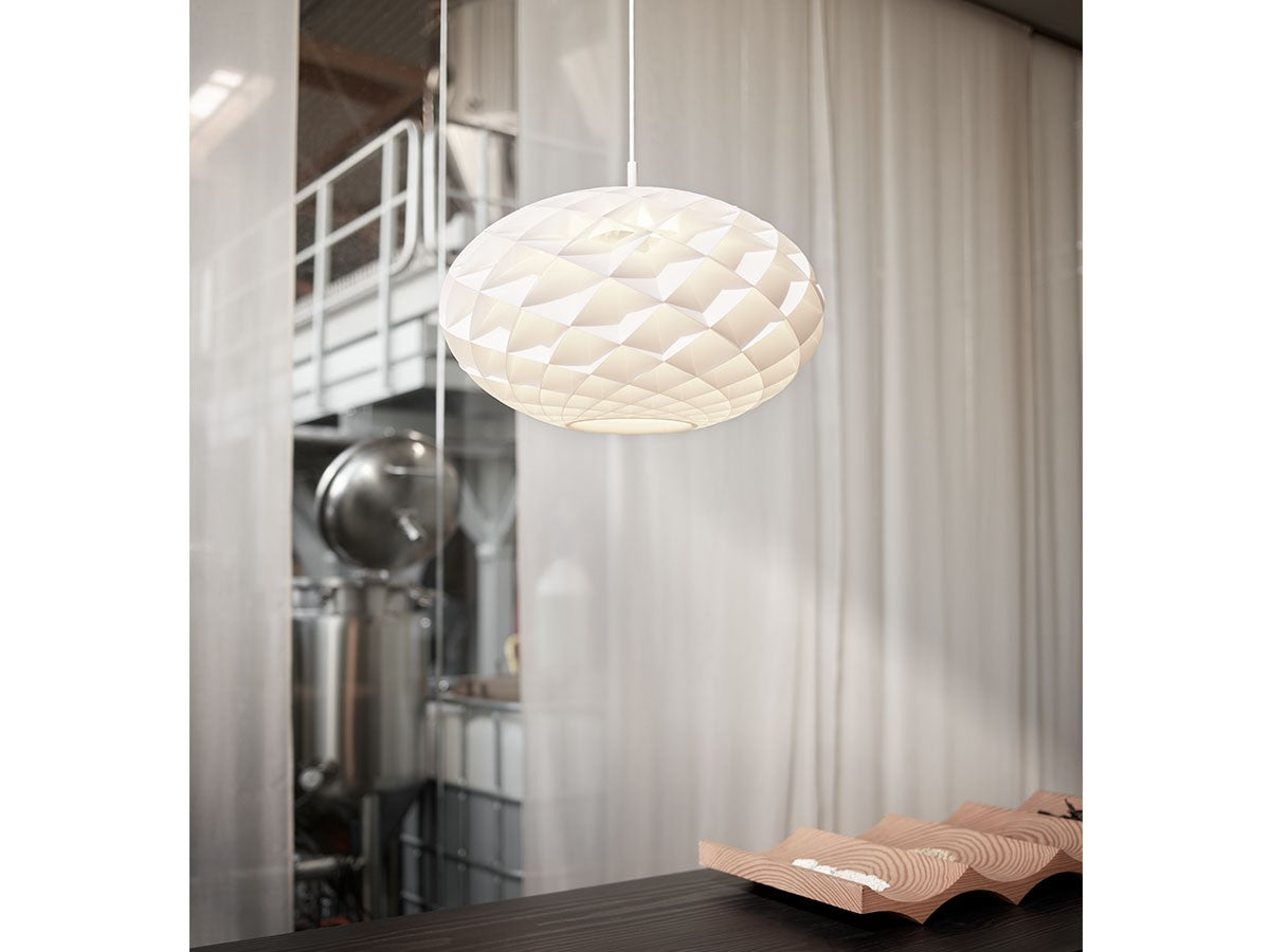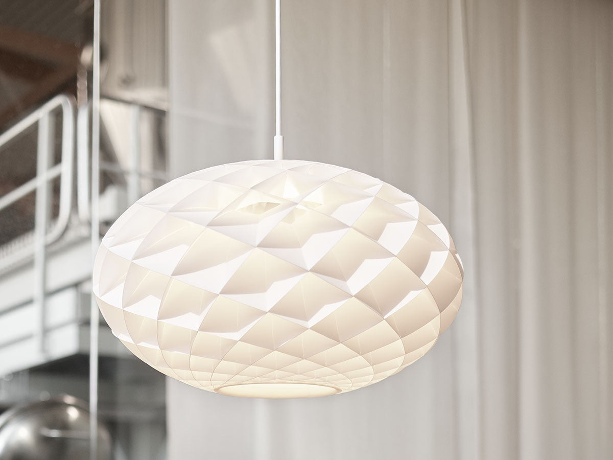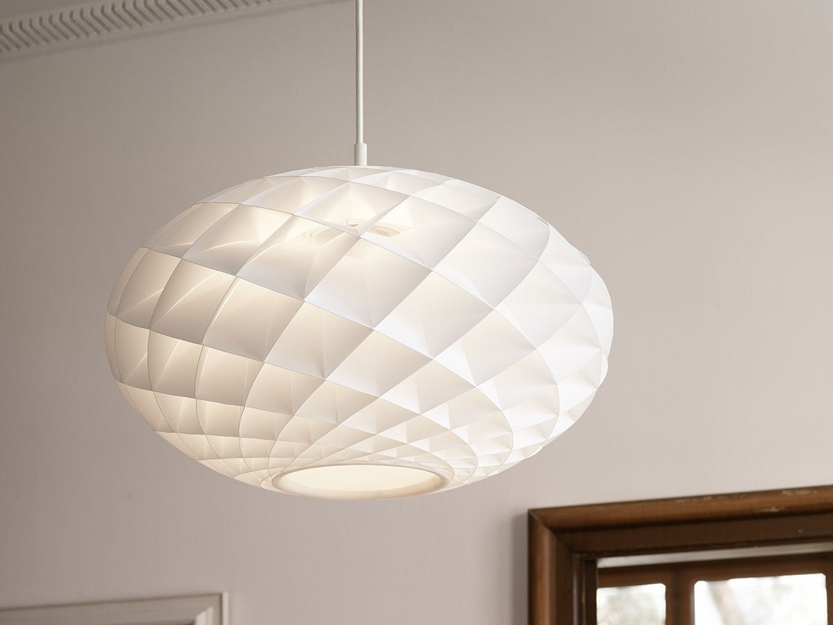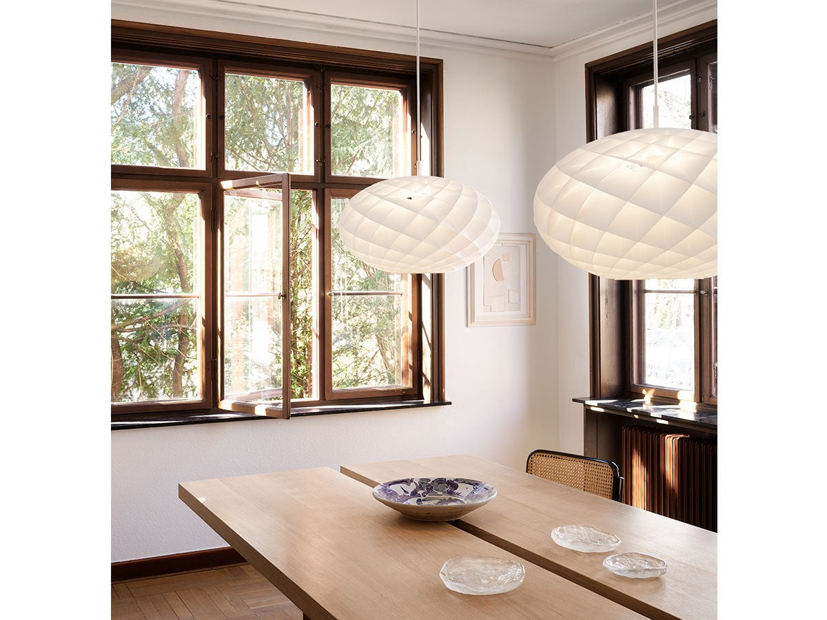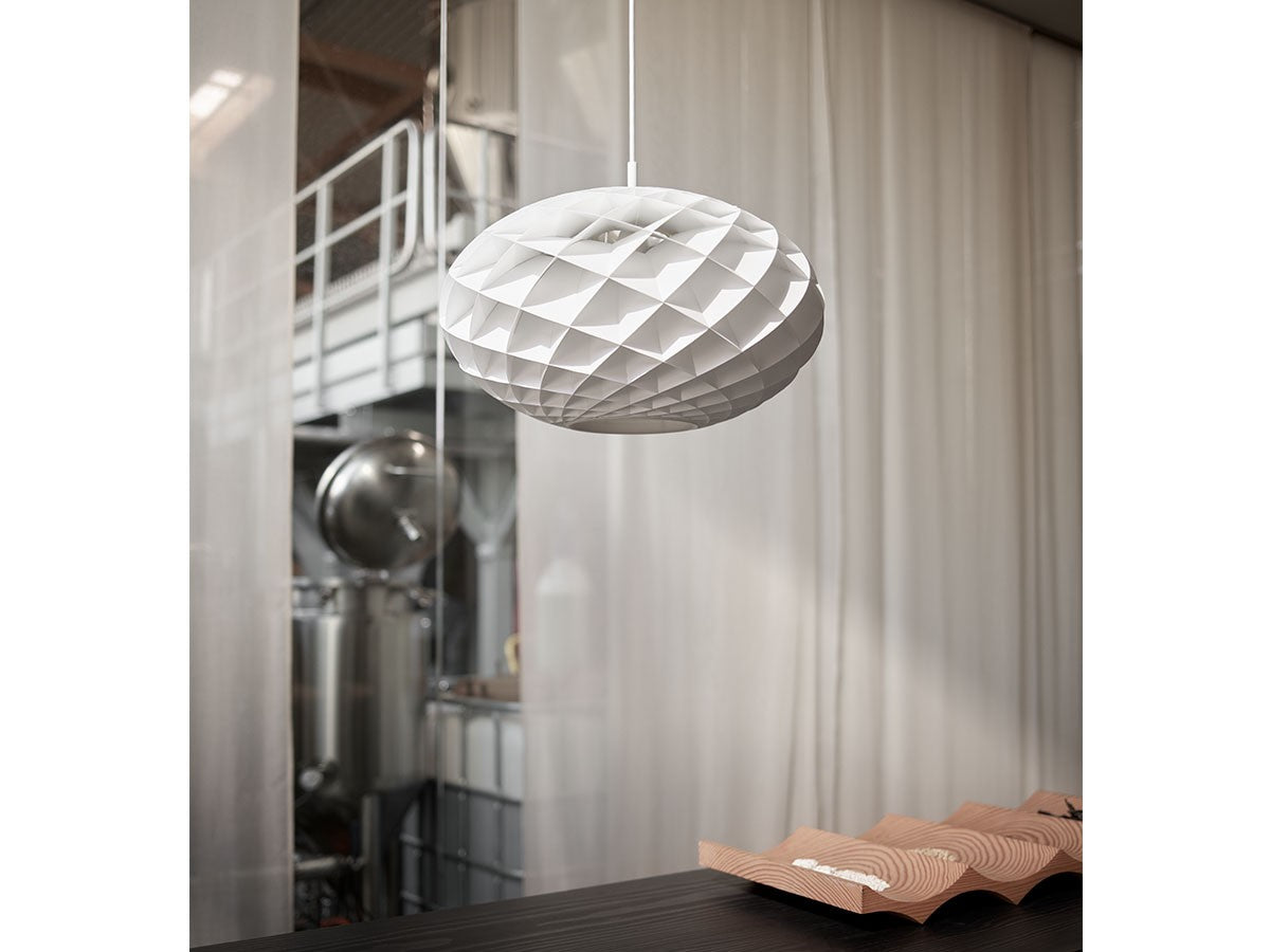 無数のひし形のセルで構成され、モダンなシャンデリアとも呼べる輝きを発するオーバル型のペンダントライト。ひまわりや巻貝などにみられる自然界の螺旋カーブを用い、フィボナッチ数列をもとにした複雑なパターンでデザインされています。一つひとつのセルが光源の直接光を遮りますが、下方45°(左右22.5°)に向けてはセルの開口部が直接光を放ち、下方を効率よく照らします。オーバル型の他に4つのサイズの球体モデルがあり、空間を理想的なバランスで照らしだします。Oivind Slaatto(オイヴィン・スロット)が設計したパテラは、古典的なシャンデリアの良さを現代的に解釈したペンダントライトとして2015年に発売されました。360°に広がるソフトな光は、複雑な設計に基づくものです。パテラはさまざまな位置に配された無数のセルで構成されており、それらが発する自然な光が周囲の人々と空間を引き立て、好ましくないシャープな影を防ぎます。一灯を吊り下げると、空間の中に光の焦点をつくります。1つの、あるいは複数のサイズを1列に整列させたり、またはランダムな配置で並べると、星空を見上げる時に感じるマジックのような感覚を生み出します。「究極の目的は、三次元の数独パズルを作り出すことでした。それは非常に数学的な試みでした。実際、私がこれまでデザインした照明の中で最も複雑なものになりました。そこには詩的な要素があるように思われました。私は、現代のシャンデリアを作りたかったのです。人々がこのランプの周りをまわってみたり、違う角度から見てみたくなってくれれば嬉しいです。そして、この照明から生命力を感じてくれることを願っています。」(オイヴィン・スロット)