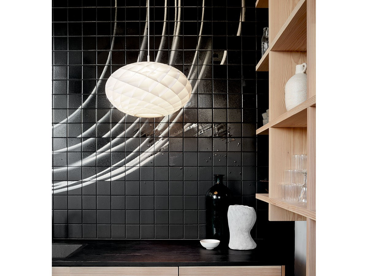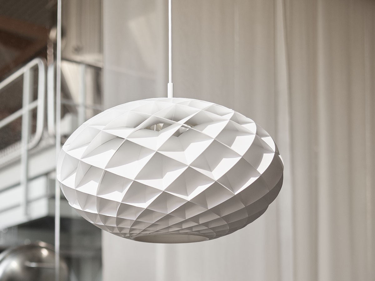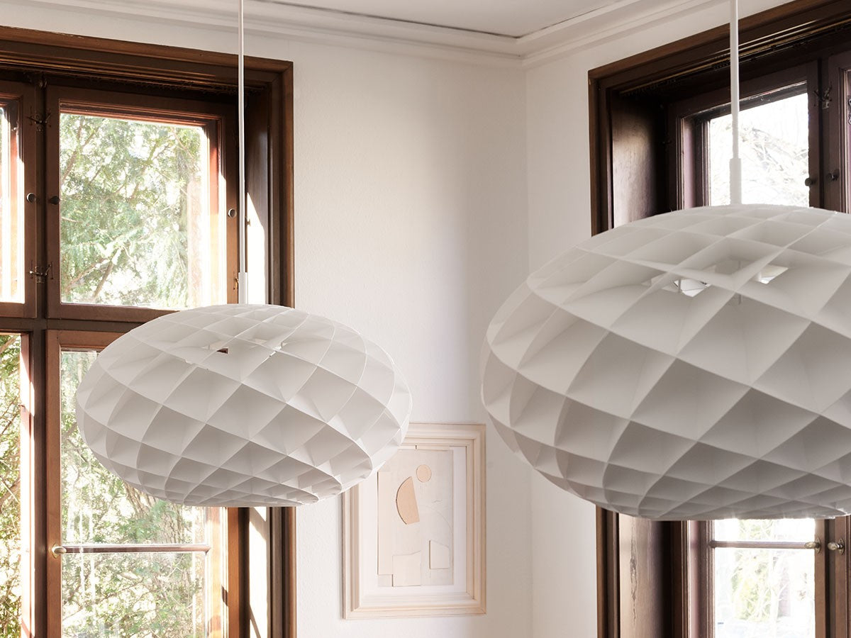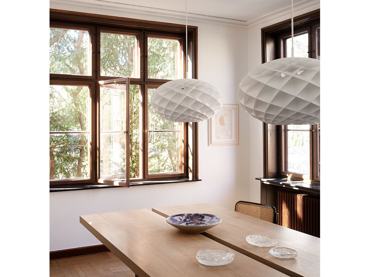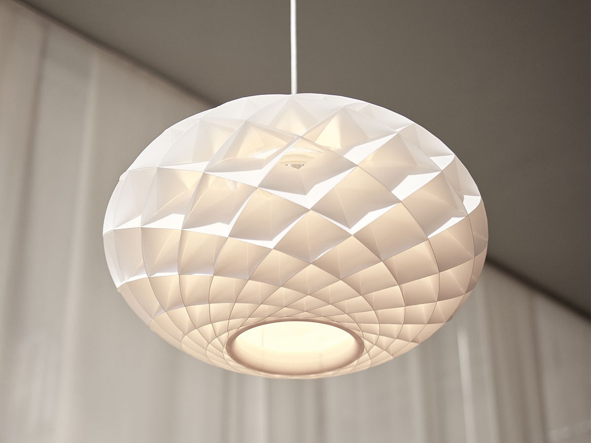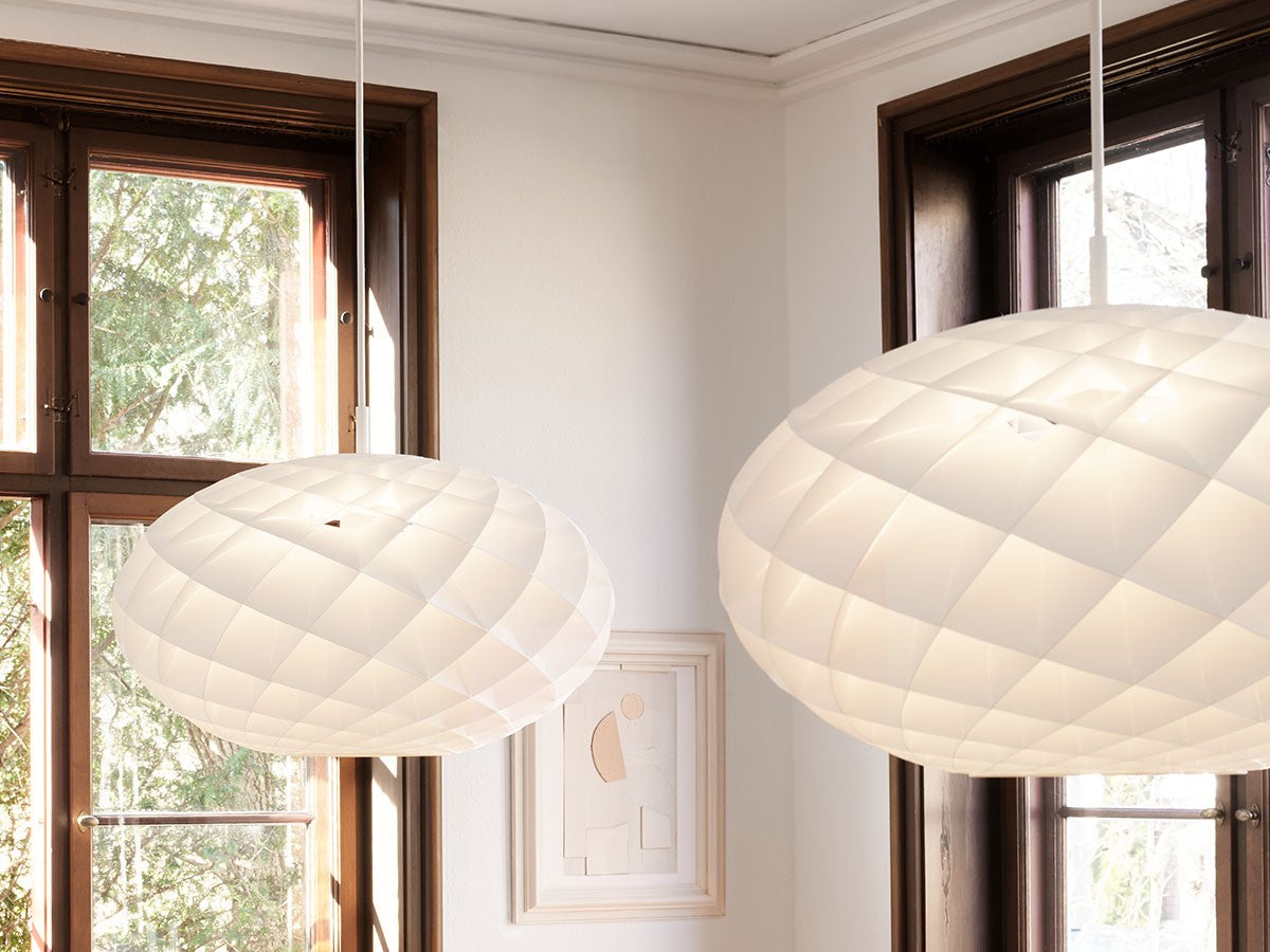 無数のひし形のセルで構成され、モダンなシャンデリアとも呼べる輝きを発するオーバル型のペンダントライト。ひまわりや巻貝などにみられる自然界の螺旋カーブを用い、フィボナッチ数列をもとにした複雑なパターンでデザインされています。一つひとつのセルが光源の直接光を遮りますが、下方45°(左右22.5°)に向けてはセルの開口部が直接光を放ち、下方を効率よく照らします。オーバル型の他に4つのサイズの球体モデルがあり、空間を理想的なバランスで照らしだします。Oivind Slaatto(オイヴィン・スロット)が設計したパテラは、古典的なシャンデリアの良さを現代的に解釈したペンダントライトとして2015年に発売されました。360°に広がるソフトな光は、複雑な設計に基づくものです。パテラはさまざまな位置に配された無数のセルで構成されており、それらが発する自然な光が周囲の人々と空間を引き立て、好ましくないシャープな影を防ぎます。一灯を吊り下げると、空間の中に光の焦点をつくります。1つの、あるいは複数のサイズを1列に整列させたり、またはランダムな配置で並べると、星空を見上げる時に感じるマジックのような感覚を生み出します。「究極の目的は、三次元の数独パズルを作り出すことでした。それは非常に数学的な試みでした。実際、私がこれまでデザインした照明の中で最も複雑なものになりました。そこには詩的な要素があるように思われました。私は、現代のシャンデリアを作りたかったのです。人々がこのランプの周りをまわってみたり、違う角度から見てみたくなってくれれば嬉しいです。そして、この照明から生命力を感じてくれることを願っています。」(オイヴィン・スロット)