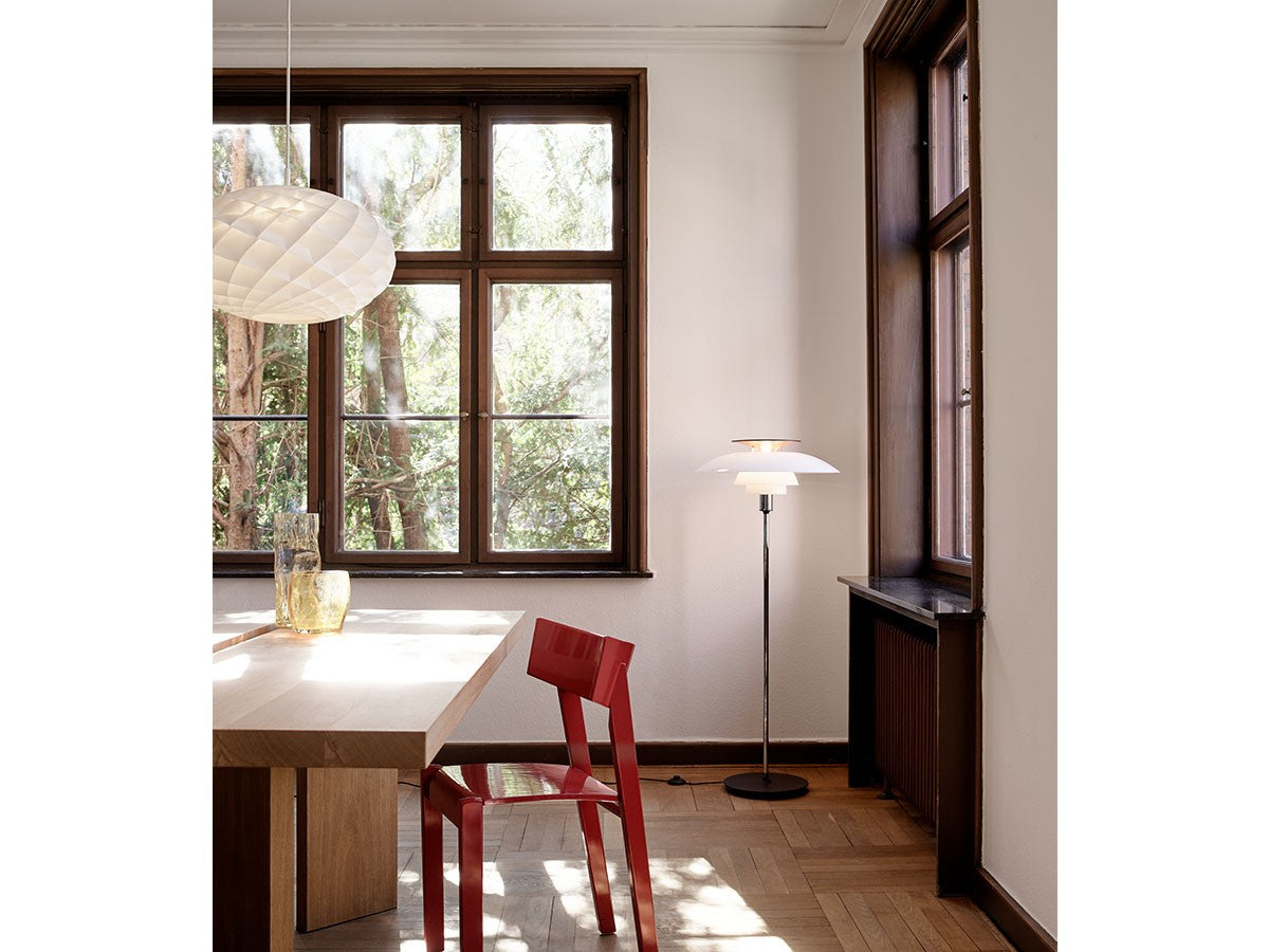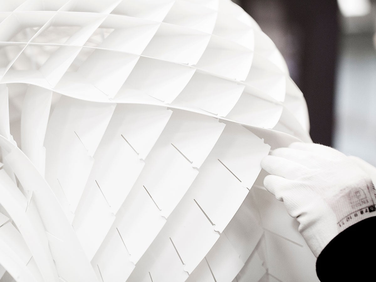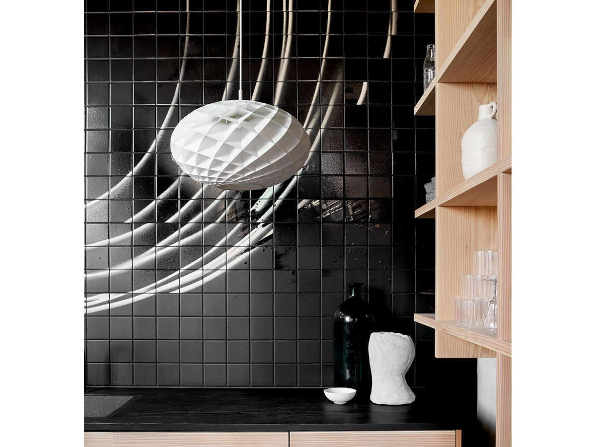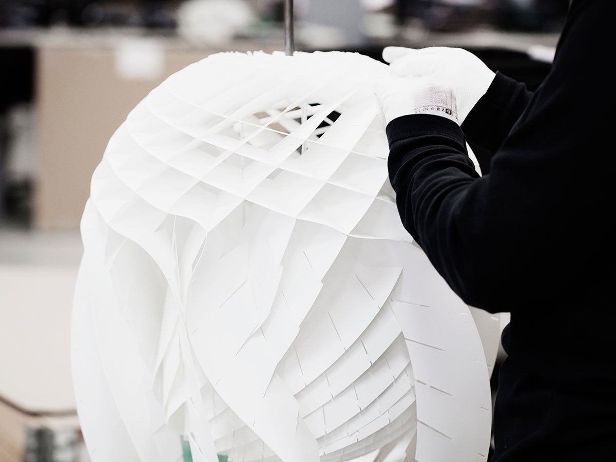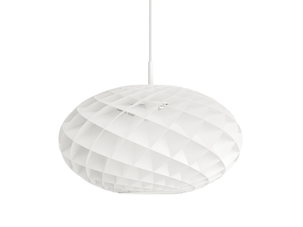 無数のひし形のセルで構成され、モダンなシャンデリアとも呼べる輝きを発するオーバル型のペンダントライト。ひまわりや巻貝などにみられる自然界の螺旋カーブを用い、フィボナッチ数列をもとにした複雑なパターンでデザインされています。一つひとつのセルが光源の直接光を遮りますが、下方45°(左右22.5°)に向けてはセルの開口部が直接光を放ち、下方を効率よく照らします。オーバル型の他に4つのサイズの球体モデルがあり、空間を理想的なバランスで照らしだします。Oivind Slaatto(オイヴィン・スロット)が設計したパテラは、古典的なシャンデリアの良さを現代的に解釈したペンダントライトとして2015年に発売されました。360°に広がるソフトな光は、複雑な設計に基づくものです。パテラはさまざまな位置に配された無数のセルで構成されており、それらが発する自然な光が周囲の人々と空間を引き立て、好ましくないシャープな影を防ぎます。一灯を吊り下げると、空間の中に光の焦点をつくります。1つの、あるいは複数のサイズを1列に整列させたり、またはランダムな配置で並べると、星空を見上げる時に感じるマジックのような感覚を生み出します。「究極の目的は、三次元の数独パズルを作り出すことでした。それは非常に数学的な試みでした。実際、私がこれまでデザインした照明の中で最も複雑なものになりました。そこには詩的な要素があるように思われました。私は、現代のシャンデリアを作りたかったのです。人々がこのランプの周りをまわってみたり、違う角度から見てみたくなってくれれば嬉しいです。そして、この照明から生命力を感じてくれることを願っています。」(オイヴィン・スロット)